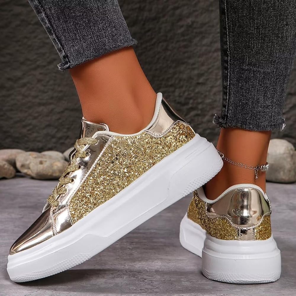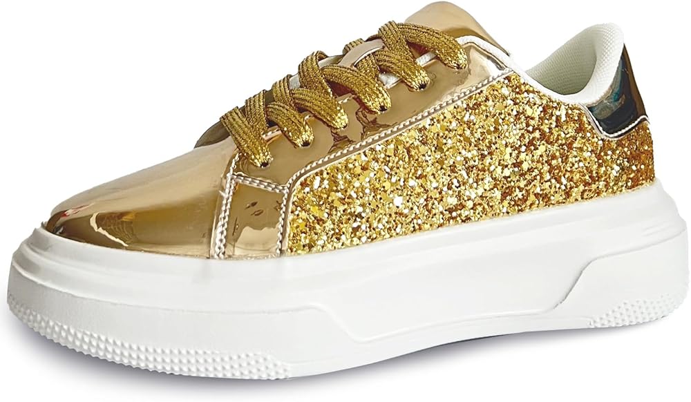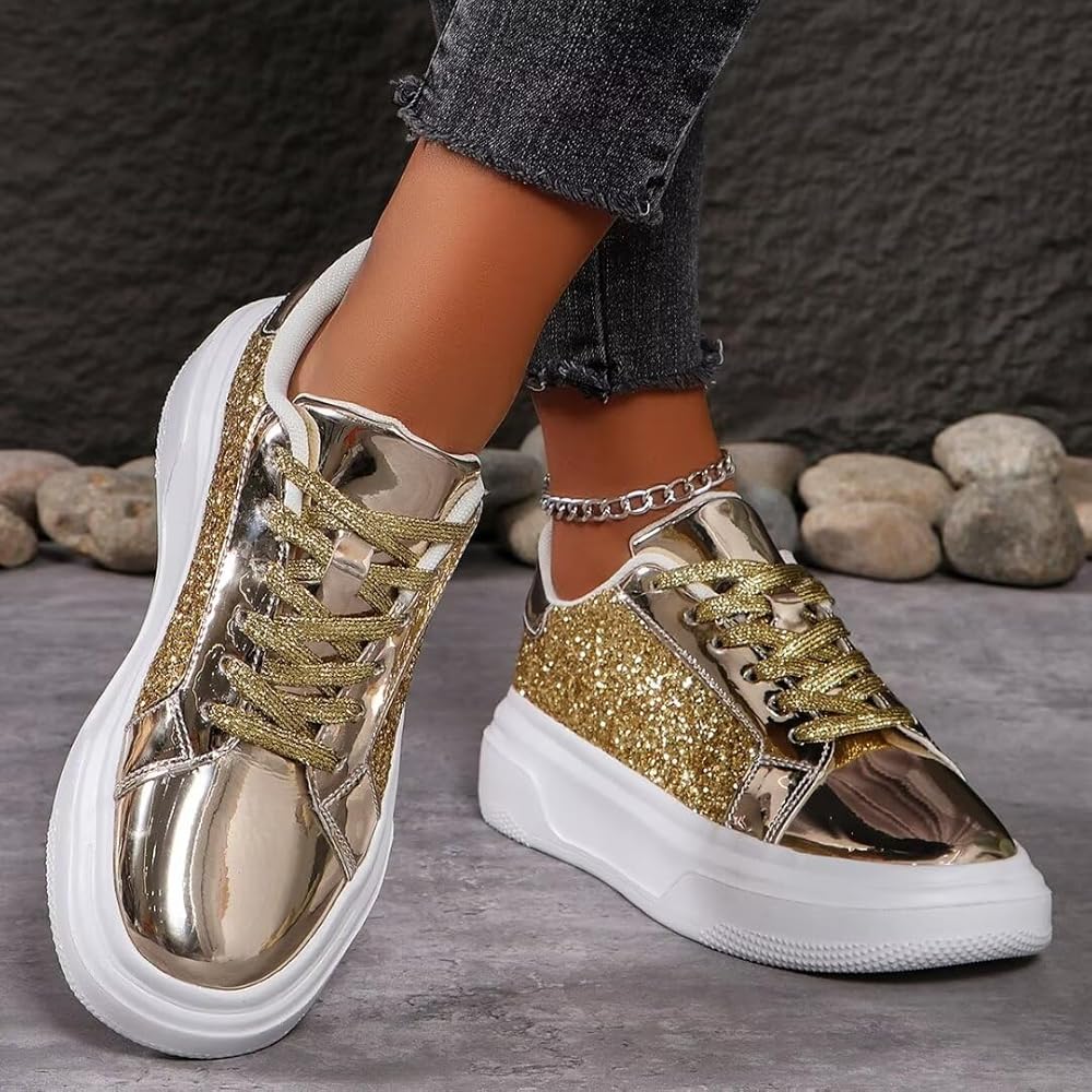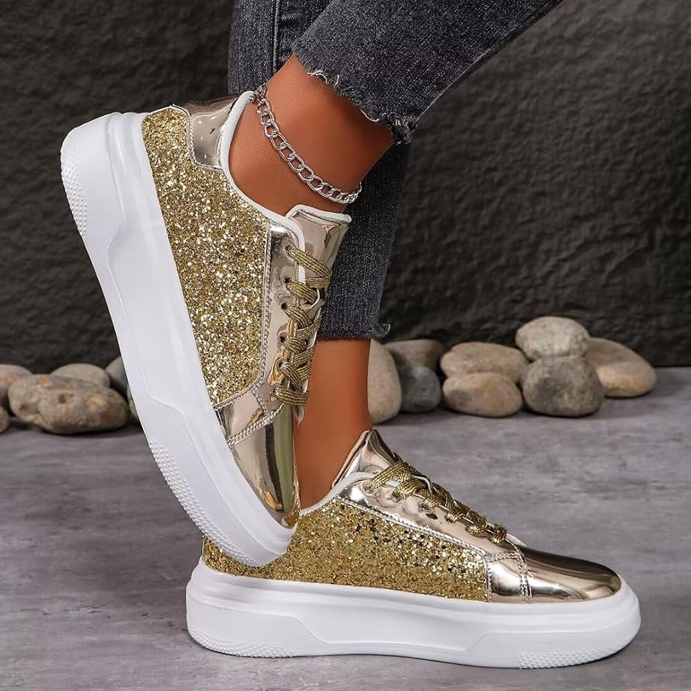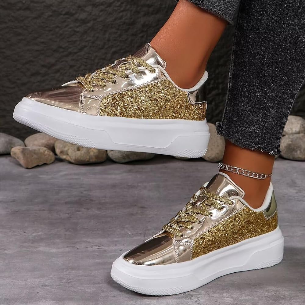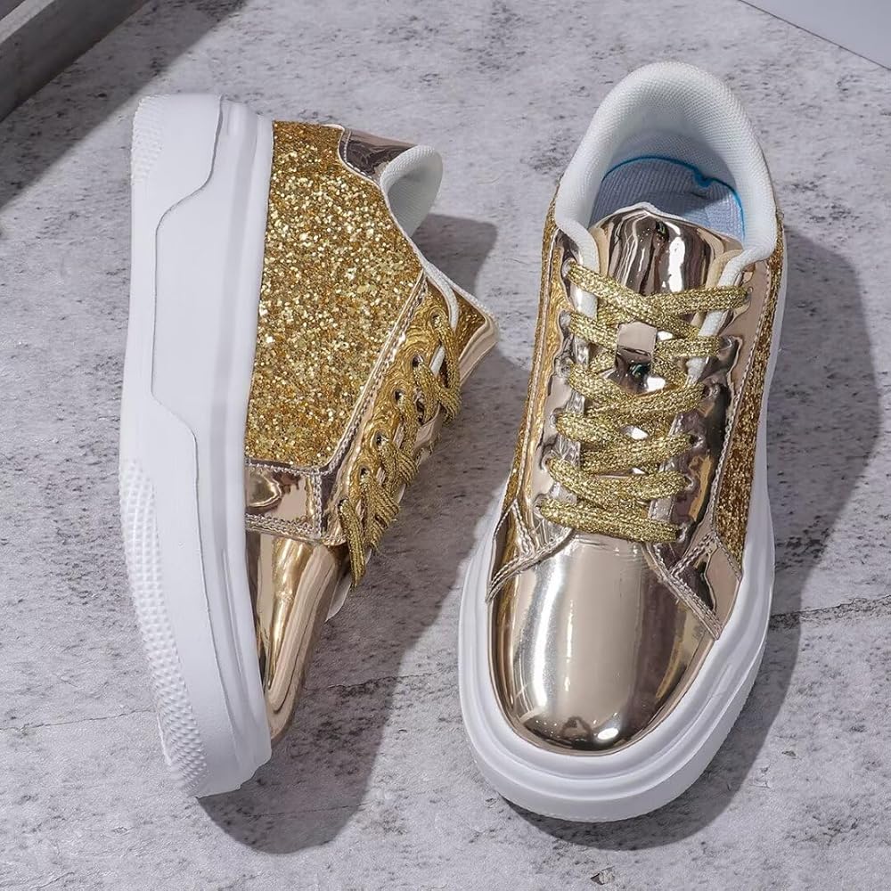 • أحذية رياضية ذات نعل سميك فضي/ذهبي: اكتشف أقصى درجات الطراز الكلاسيكي والراحة العصرية مع الأحذية اللامعة للنساء. توفر أحذية التنس خفيفة الوزن للغاية لمسة نهائية جلدية أنيقة، مما يوفر مظهرًا عصريًا ولكن كاجوال للارتداء اليومي. للسفر أو العمل أو الترفيه، تم تصميم هذه الأحذية الرياضية لتبقيك مرتاحًا وأنيقًا طوال اليوم.