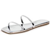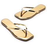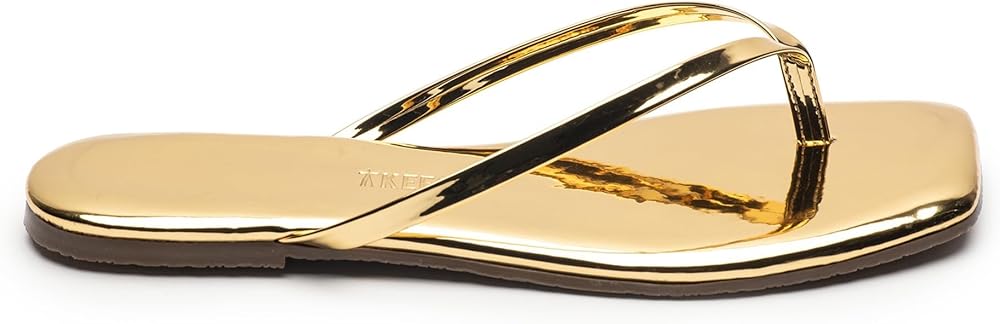 Featuring a shiny and gleaming finish, the TKEES Square Toe Lily Mirror Flats are sure to leave a standout appeal. The slip-on footwear has bovine leather upper, lining, and insole construction with toe-post strap. Open square toe silhouette. Bovine leather midsole. Rubber outsole. Made in Brazil.