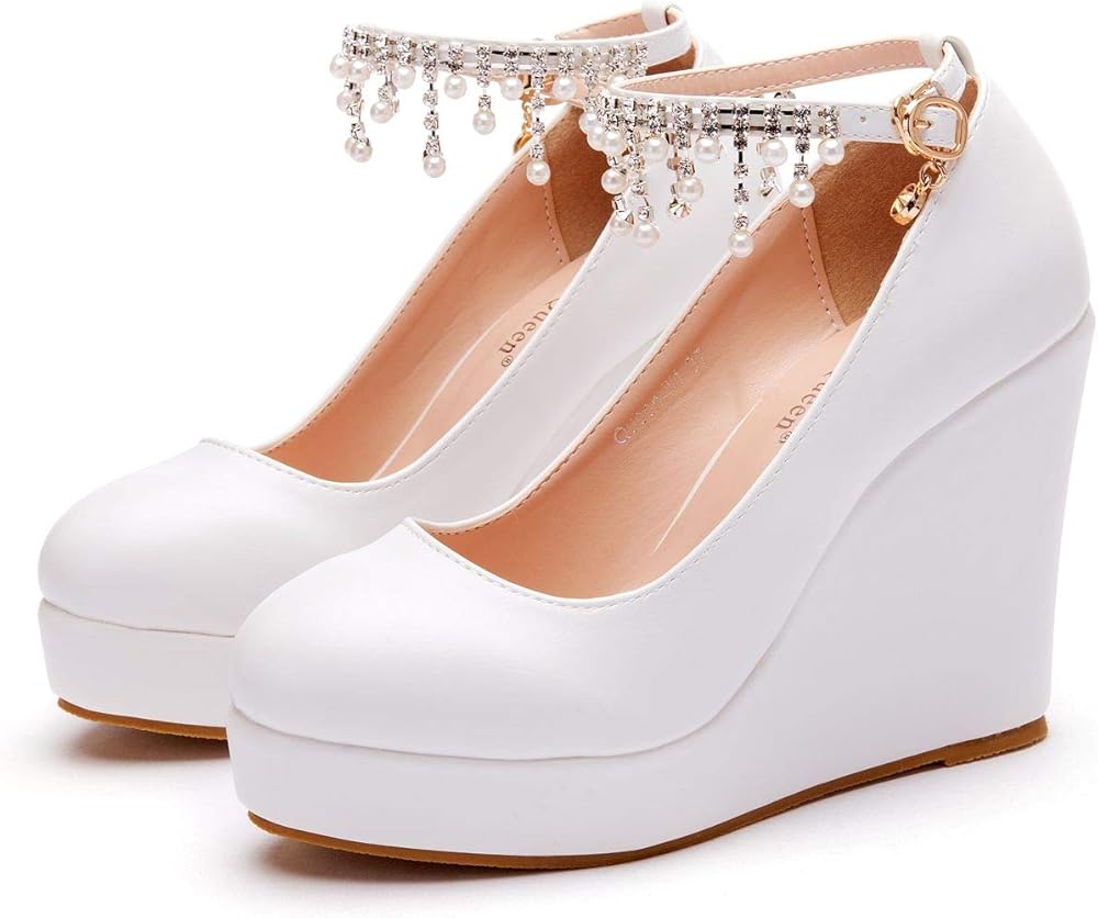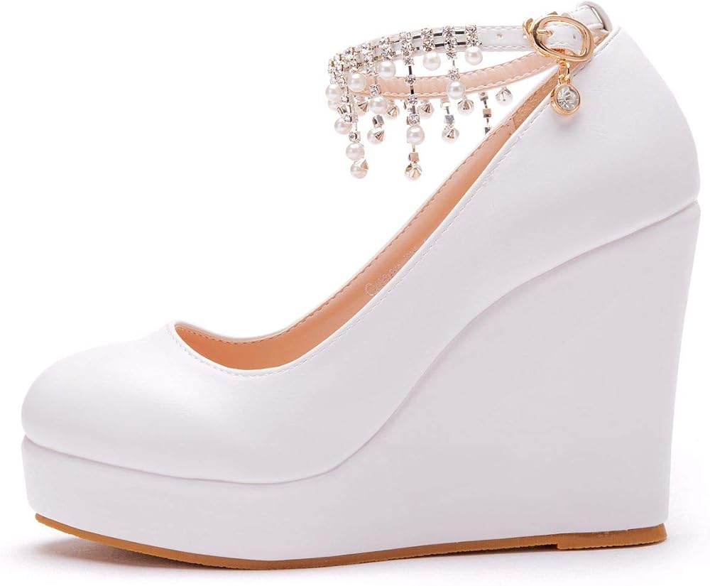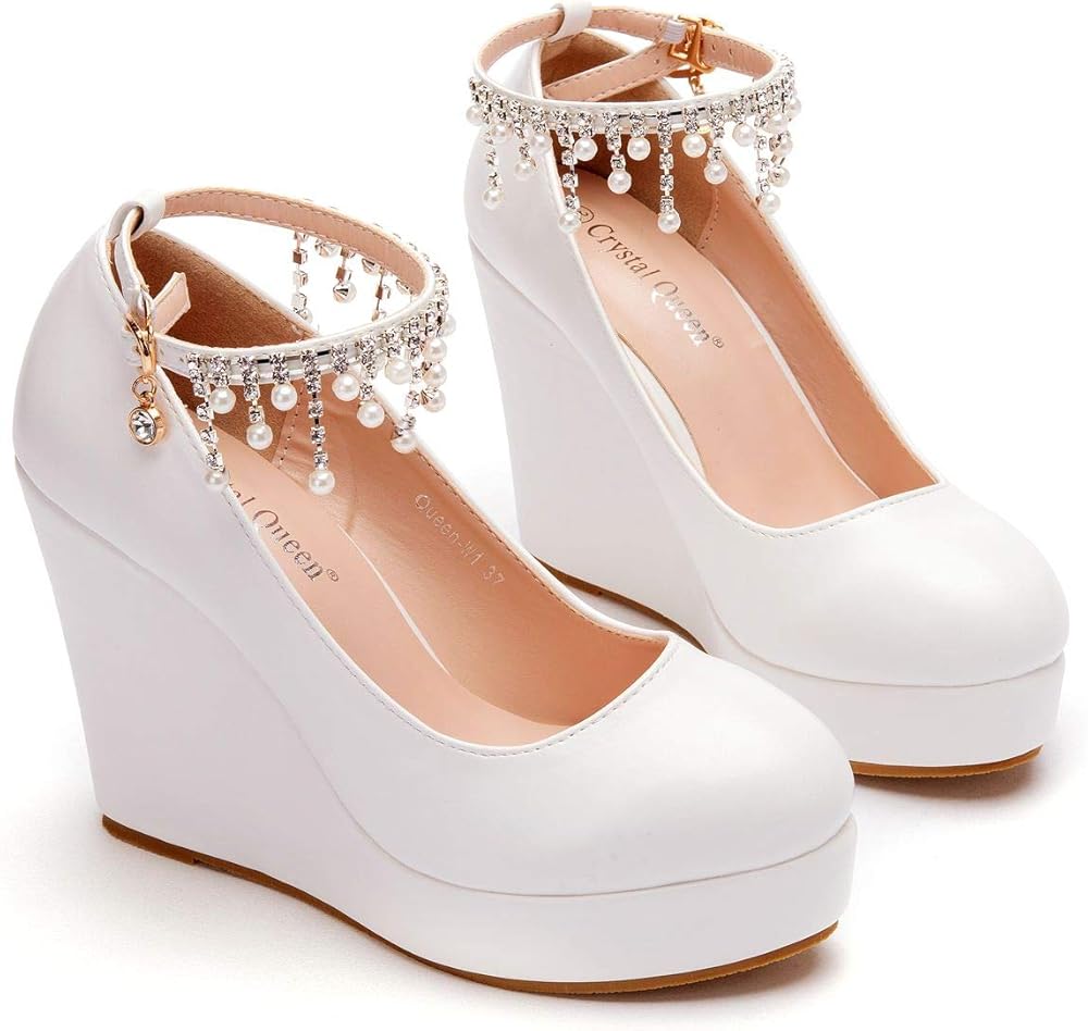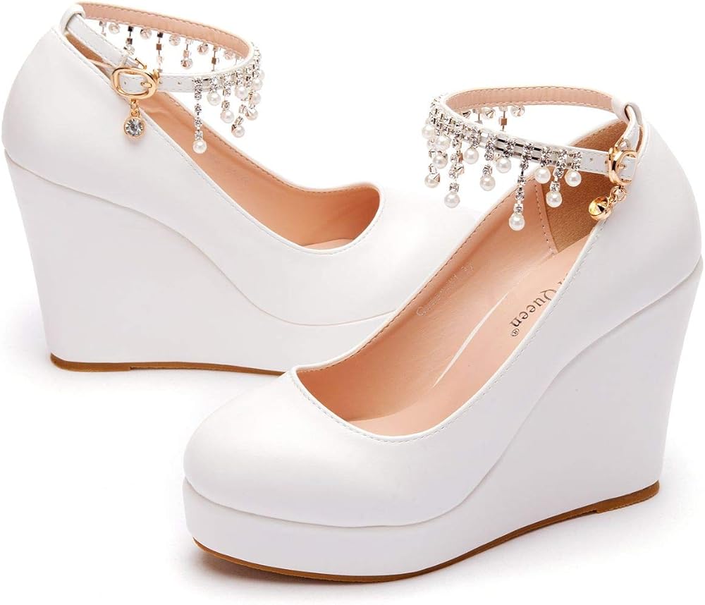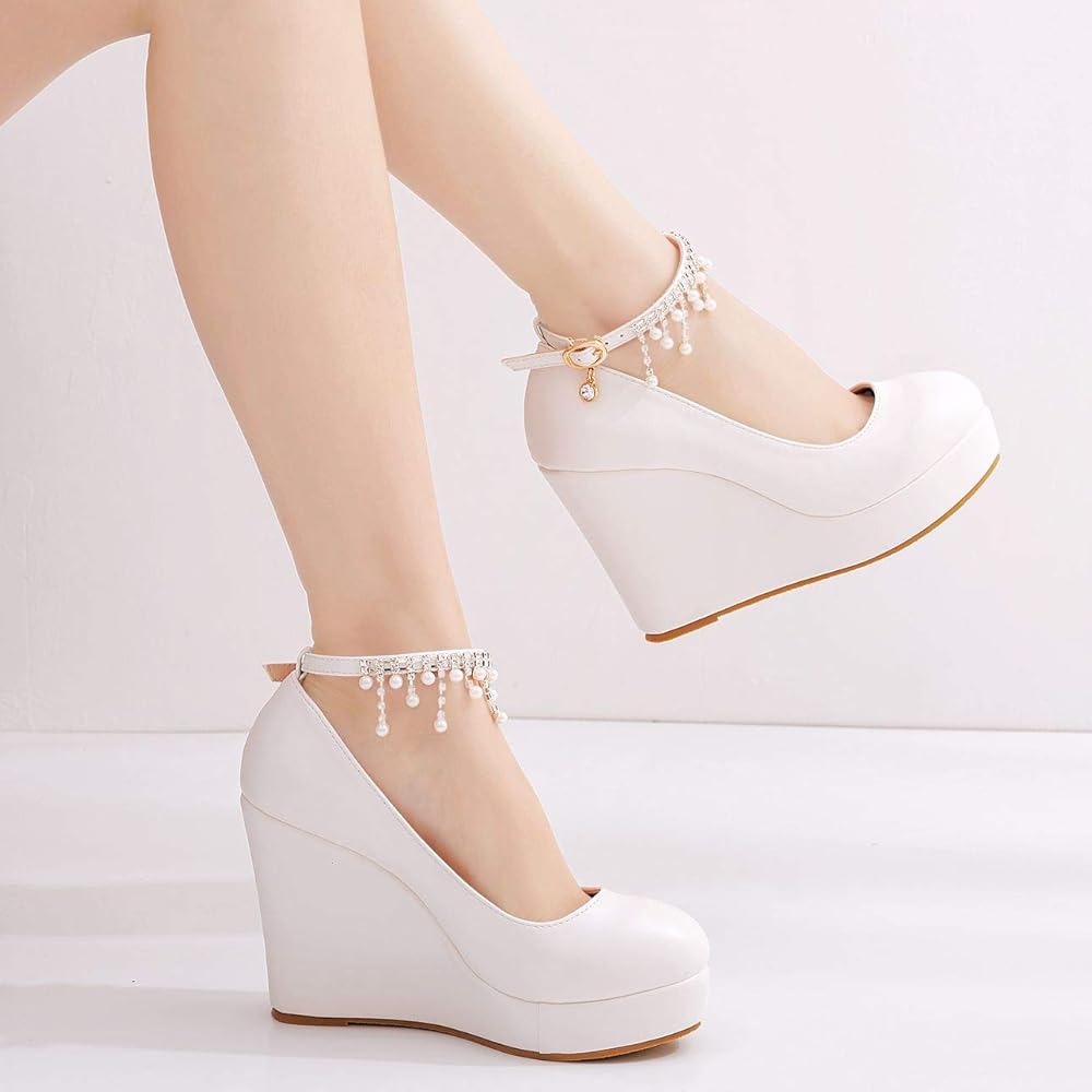 منصة بيضاء أسافين مضخات أحذية شرابة سلسلة مع اللؤلؤ