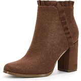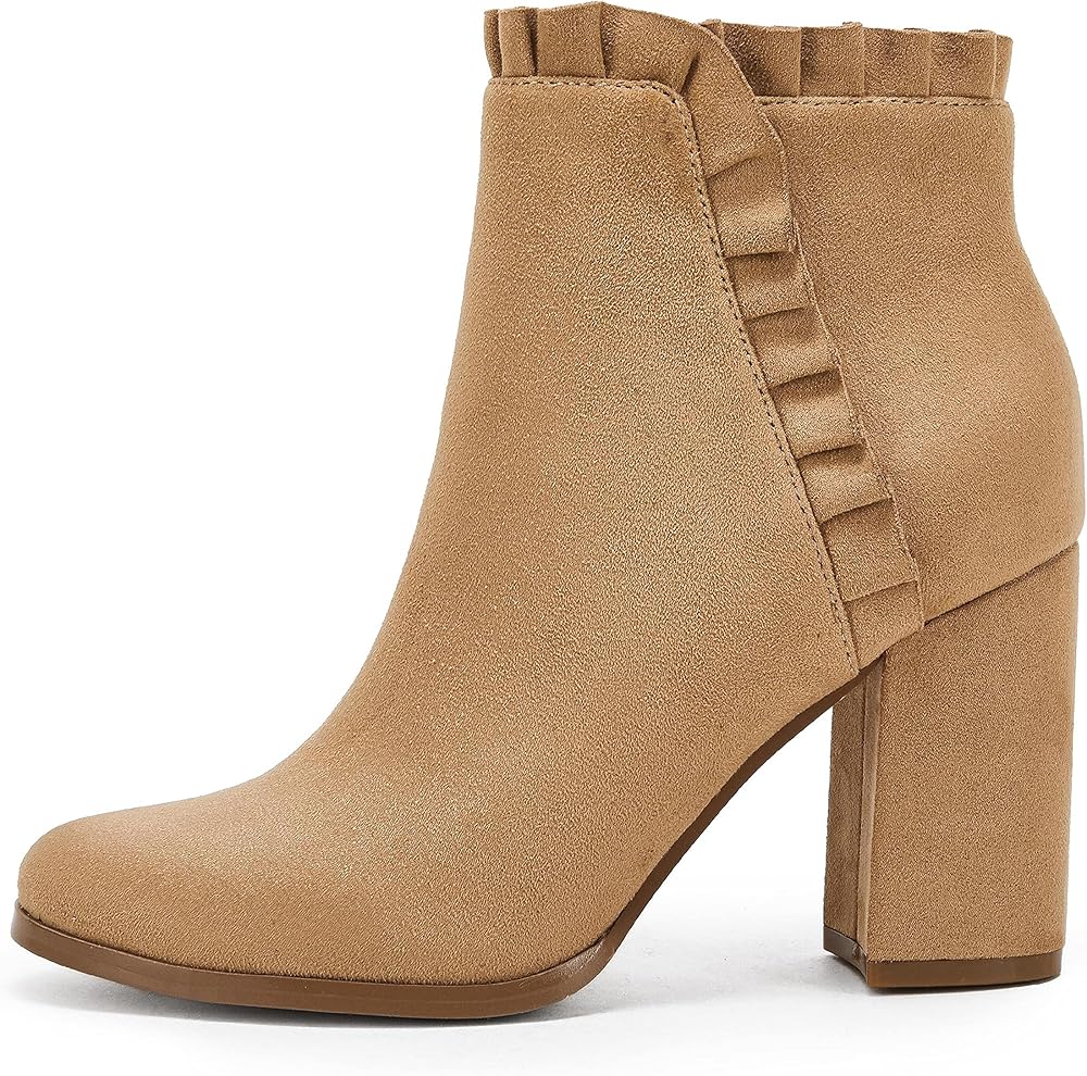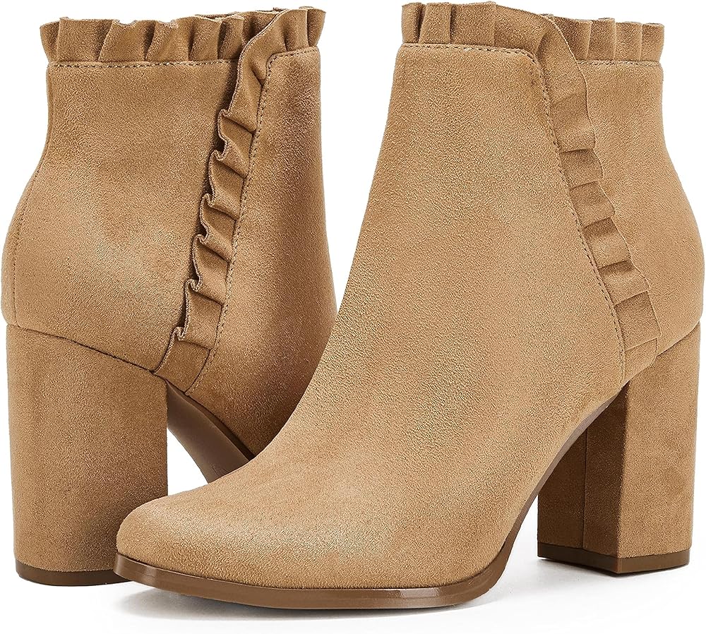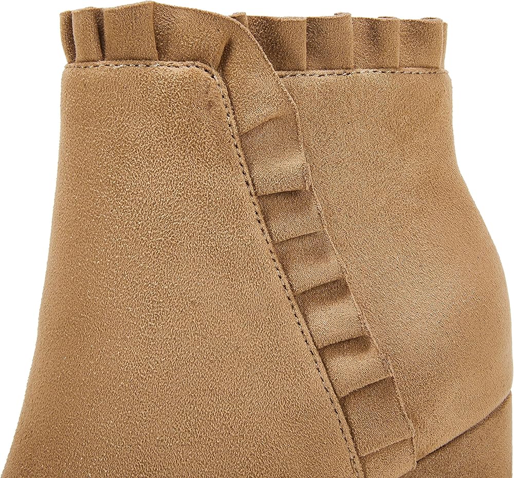 • المميزات - أحذية كاحل كاجوال للخريف والشتاء للسيدات، كعب عالٍ مكتنز، مقدمة دائرية مغلقة، جلد سويدي صناعي، سحاب جانبي، تصميم مكشكش، أحذية غربية