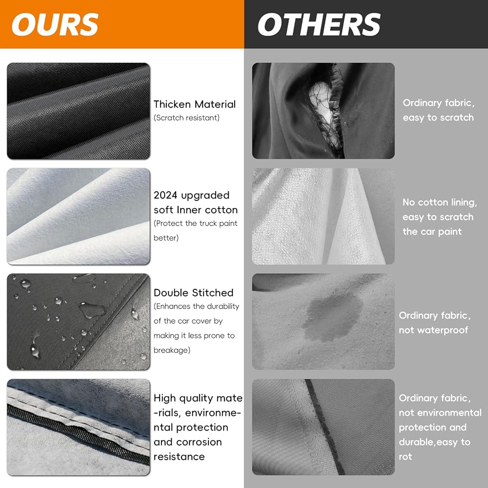 【أحدث المواد شديدة التحمل】غطاء الشاحنة GUNHYI ذو 7 طبقات مصنوع من أحدث المواد المقاومة للماء بنسبة 100%، وهو مثالي للاستخدام في أيام المطر والثلج. البطانة الداخلية من القطن الناعم لحماية طلاء السيارة بشكل أفضل. لقد أضفنا عوامل مضادة للشيخوخة لضمان أن يكون الغطاء أقوى وأكثر متانة تحت الأشعة فوق البنفسجية القاسية.