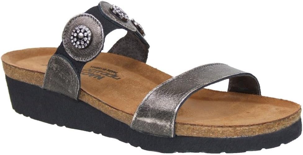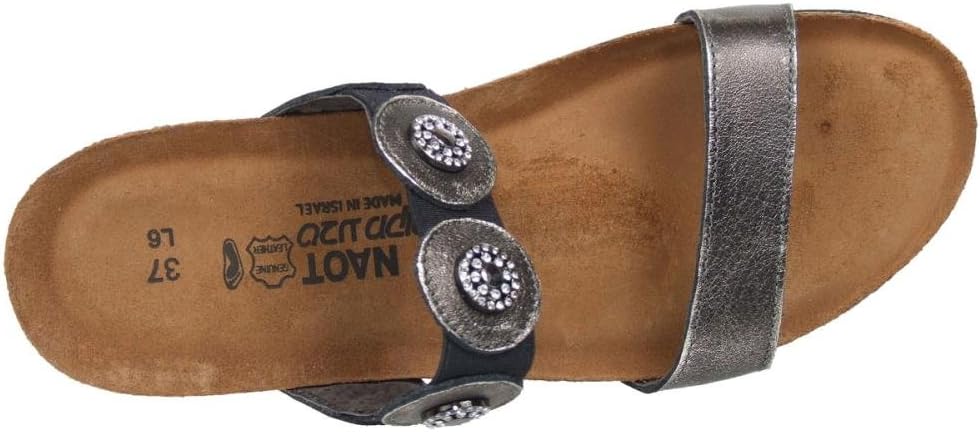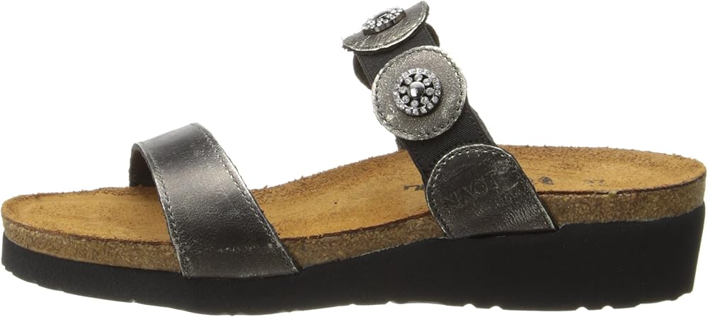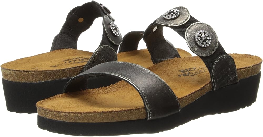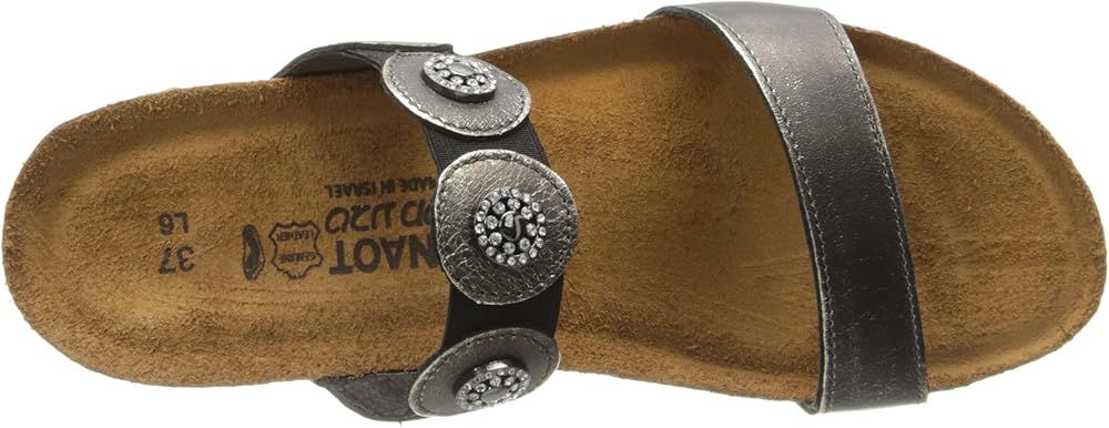 Naot Marissa هو صندل أنثوي منزلق مع زخارف من حجر الراين على مشط القدم والثقوب من أجل إمكانية التعديل. نعل داخلي من الفلين التشريحي واللاتكس من Naot ملفوف بجلد سويدي مدلل ويتشكل على شكل القدم مع الارتداء.