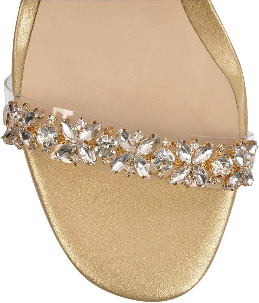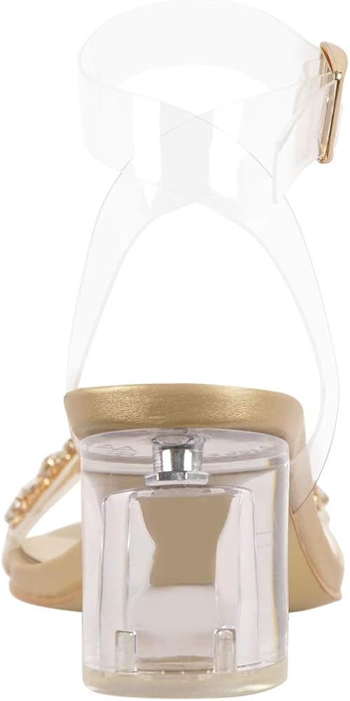 Yolkomo صنادل نسائية بكعب متوسط ذهبي مرصع بأحجار الراين وحزام كاحل شفاف ومرصع بالكريستال ومفتوحة عند الأصابع فستان مثير لؤلؤي سندريلا بكعب أكريليك مقاس 8