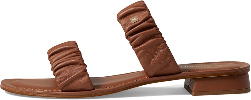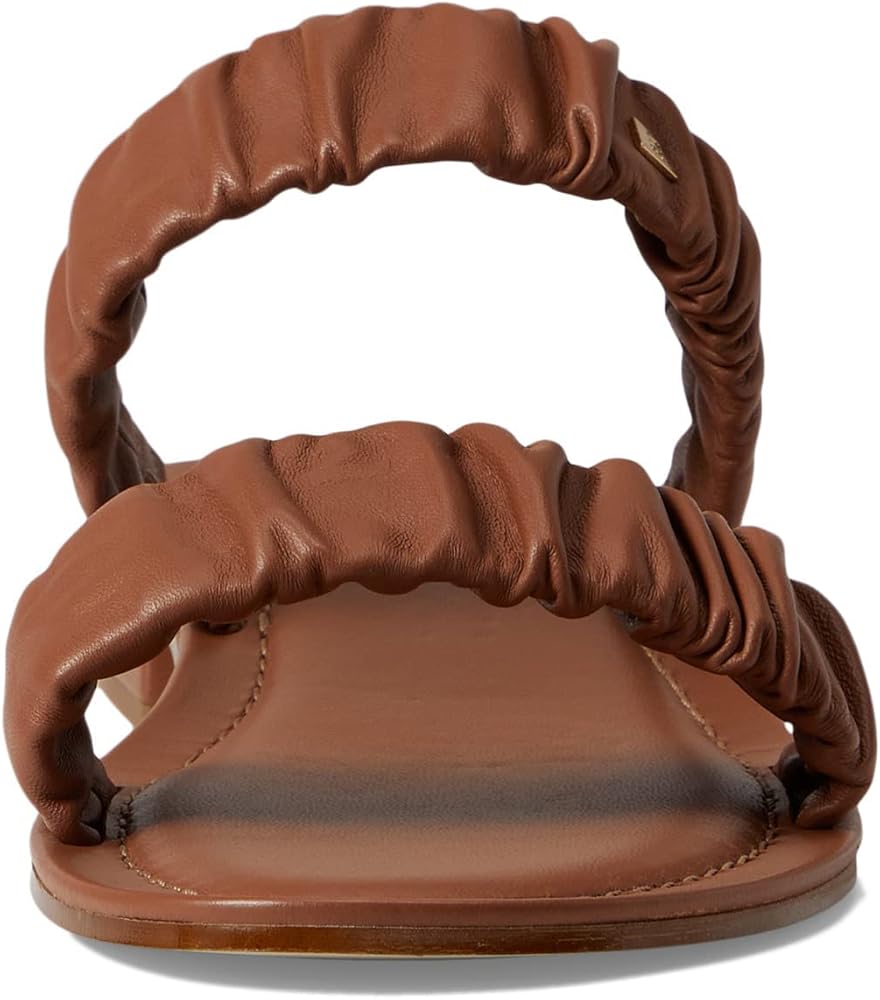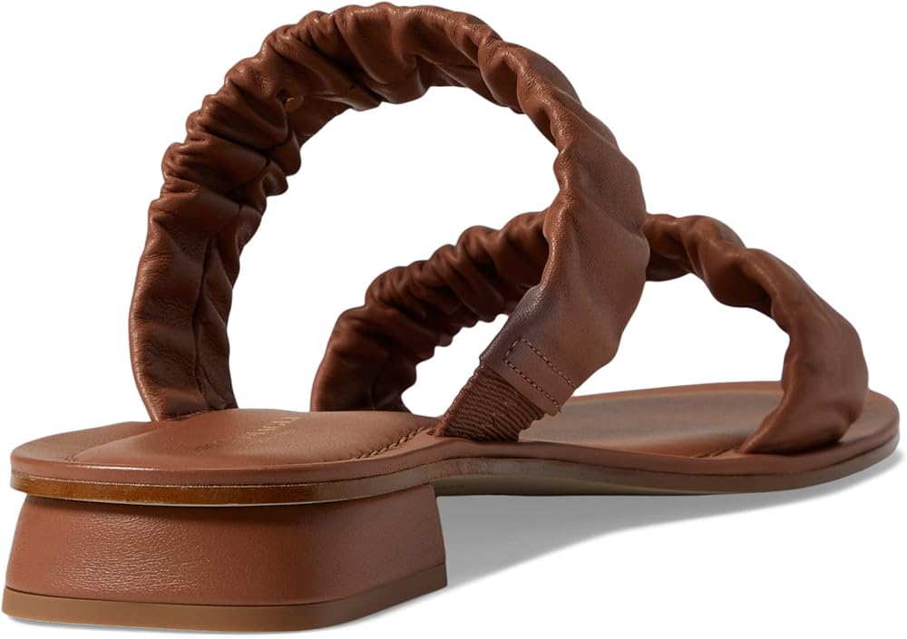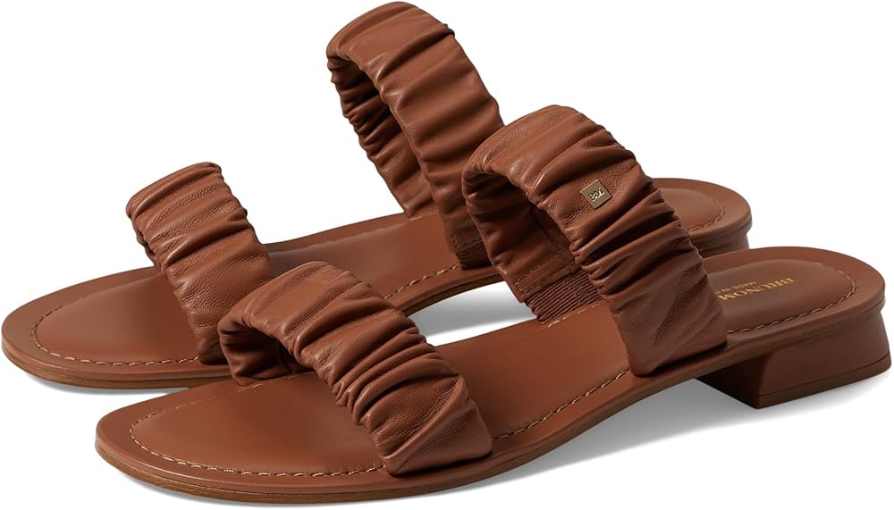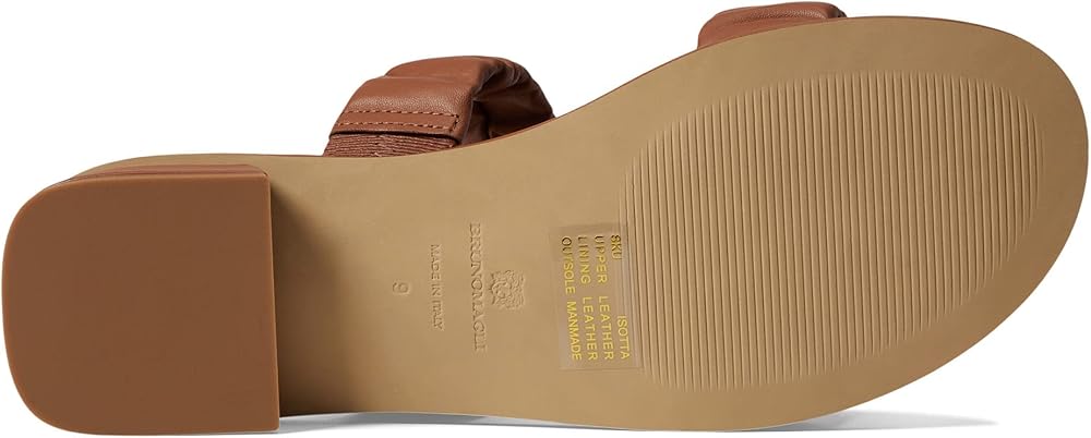 Mark a style statement by donning the stylish Bruno Magli Isotta sandals. Ruched leather dual strap upper. Leather lining and insole. Slip-on style. Open, round toe design. Stacked heels. Leather outsole.