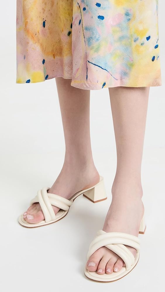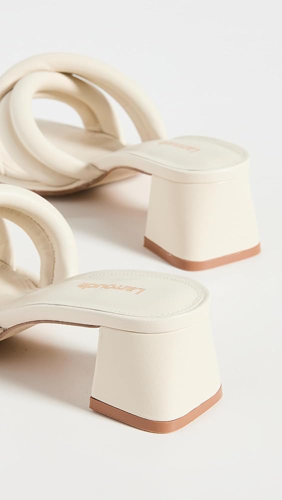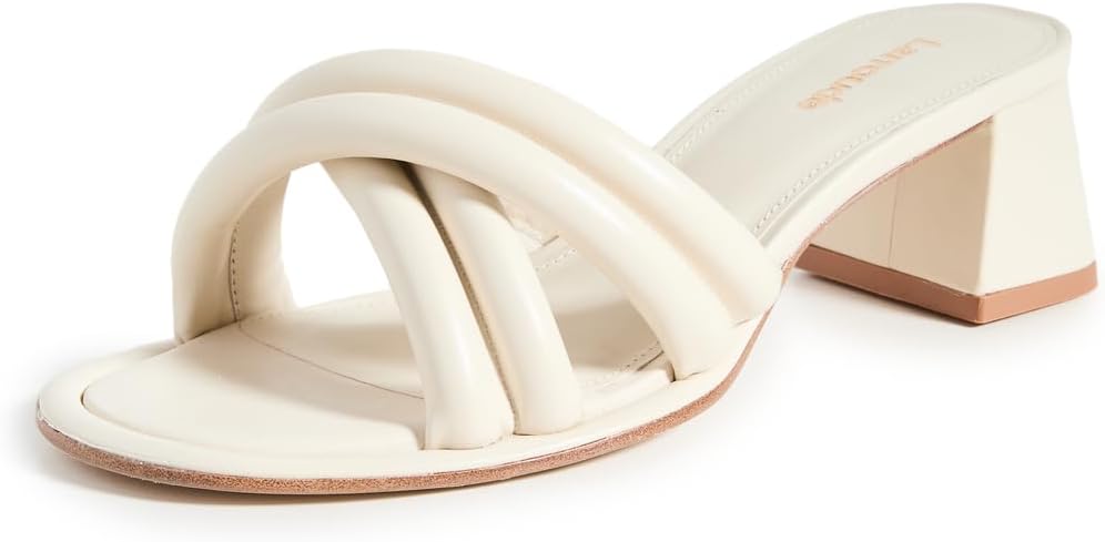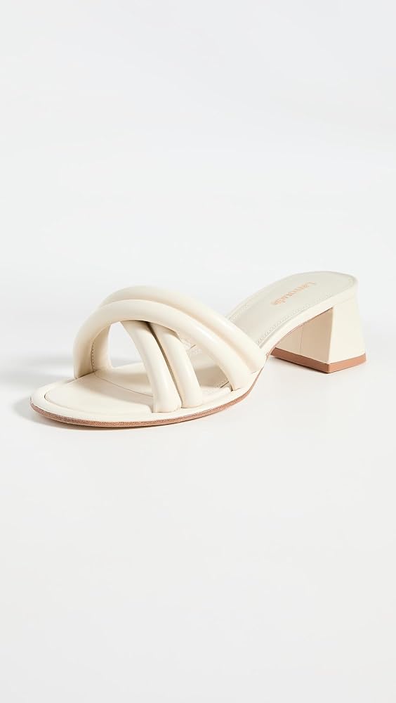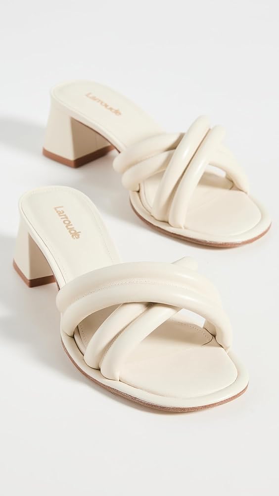 Puffy crisscross straps form the upper of these minimalist Larroude leather sandals, a go-with-anything pick for polished and casual outfits alike.