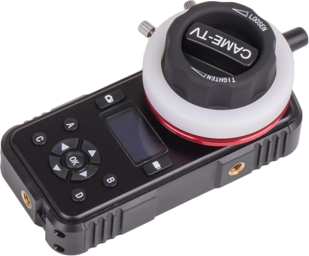 【تصميم شاشة OLED】تتميز وحدة التحكم CAME-TV MINI Follow Focus بقرص وضع العلامات المدمج وشاشة OLED التي توفر مستوى البطارية وحالة الاتصال والمعايرة والسفر ومعلومات الذاكرة وما إلى ذلك، ويمكن التنقل في قوائمها باستخدام الأزرار الموجودة على وحدة التحكم. تدعم وحدة التحكم والمحرك أيضًا وظائف التشغيل/الإيقاف والغالق، بالإضافة إلى وضع حدود A/B/C/D الصارمة لمزيد من التحكم في الكاميرا والعدسة. كما أنها تحتوي على حلقة لربط وحدة التحكم بحزام أو حبل قصير.