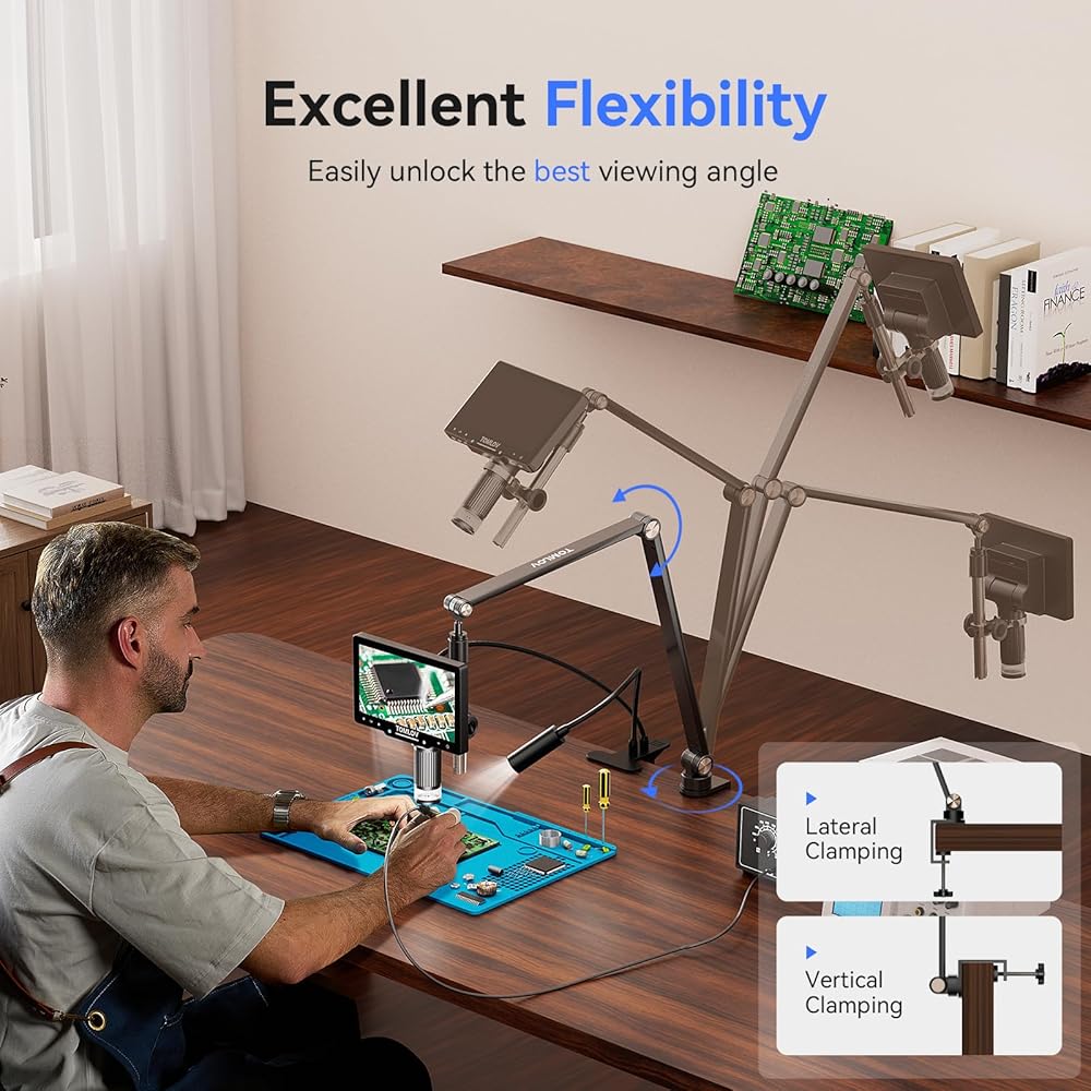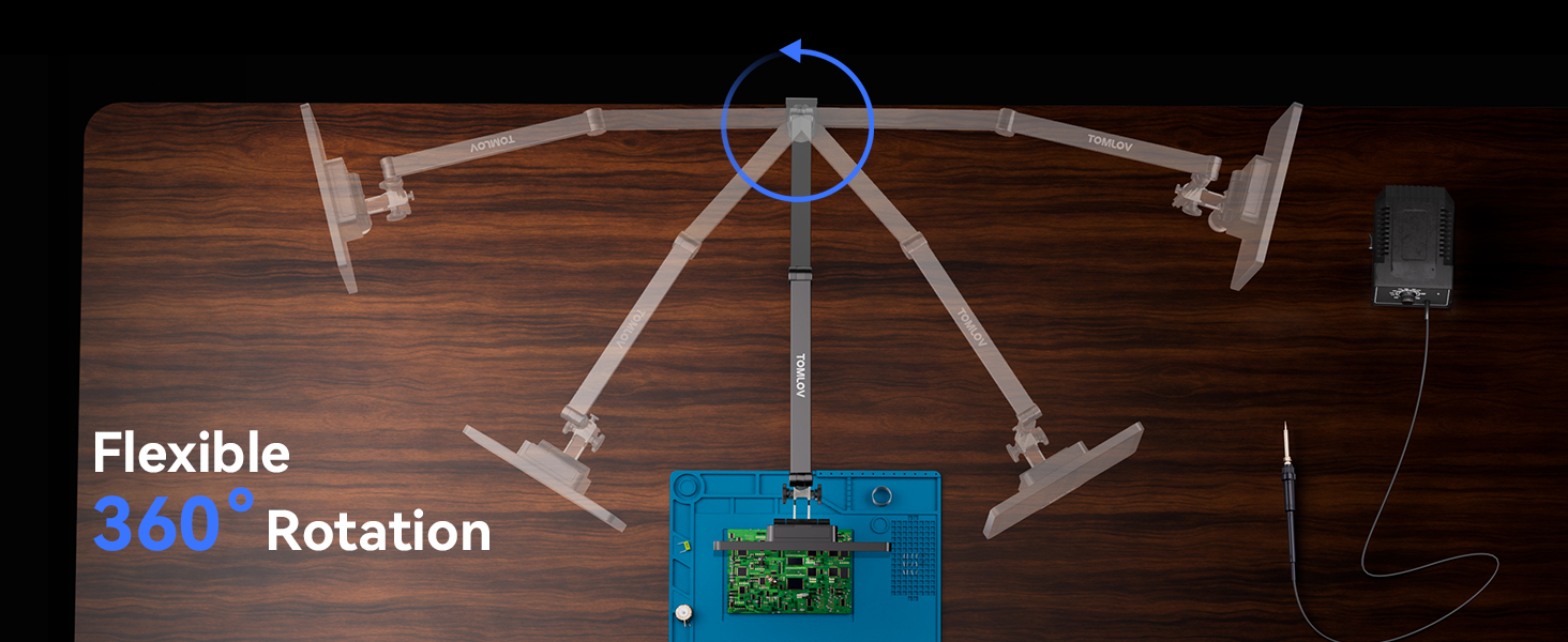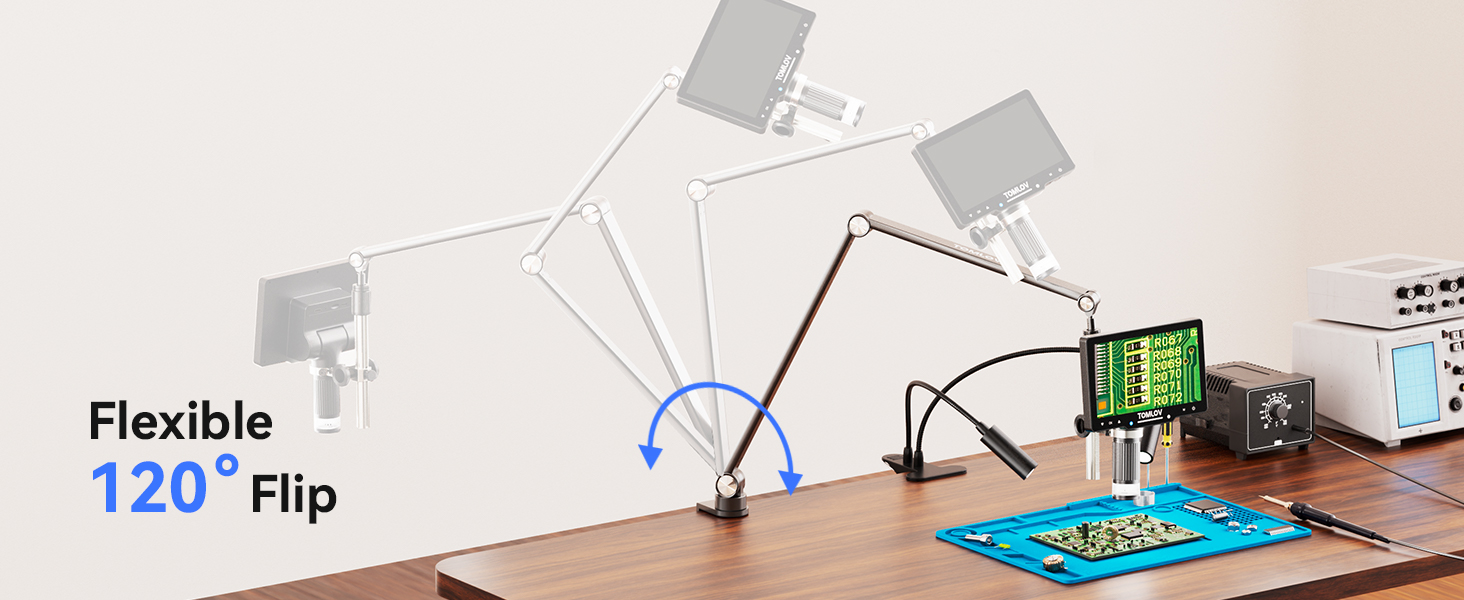 【أحدث مجهر رقمي بذراع مرن】لقد ابتكر TOMLOV DM501S تجربة مراقبة جديدة. يسمح لك تصميم الذراع المرن الذي يدور ثلاثي المحاور والجزء السفلي بدوران 360 درجة بتعديل زاوية المراقبة حسب رغبتك، ليس فقط أفقيًا وعموديًا، ولكن أيضًا يدور 360 درجة في جميع الاتجاهات، بحيث يمكنك بسهولة الحصول على مساحة كبيرة اللحام، يمكنك التقاط عرض كامل للعملة المعدنية بسهولة، والحصول على أفضل زاوية مراقبة. بالإضافة إلى ذلك، شغل مساحة أقل والمزيد من الإمكانيات.