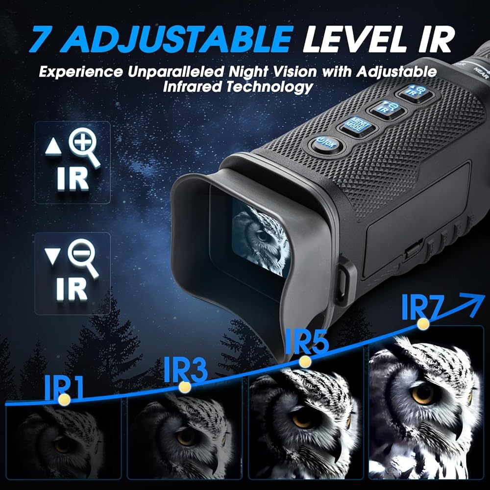 رؤية واضحة في الظلام بنسبة 100%: تساعدك منظار الرؤية الليلية المطور على المراقبة ليلاً على شاشة هاتف أكبر، وتتميز بإضاءة الأشعة تحت الحمراء 940 نانومتر و7 مستويات لتعديل مستويات الأشعة تحت الحمراء. يجلب لك تجربة رائعة أثناء النهار والظلام بنسبة 100% في استكشافاتك البرية