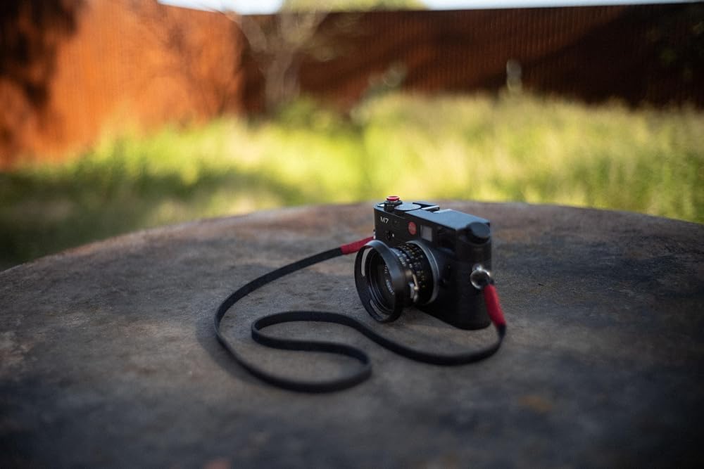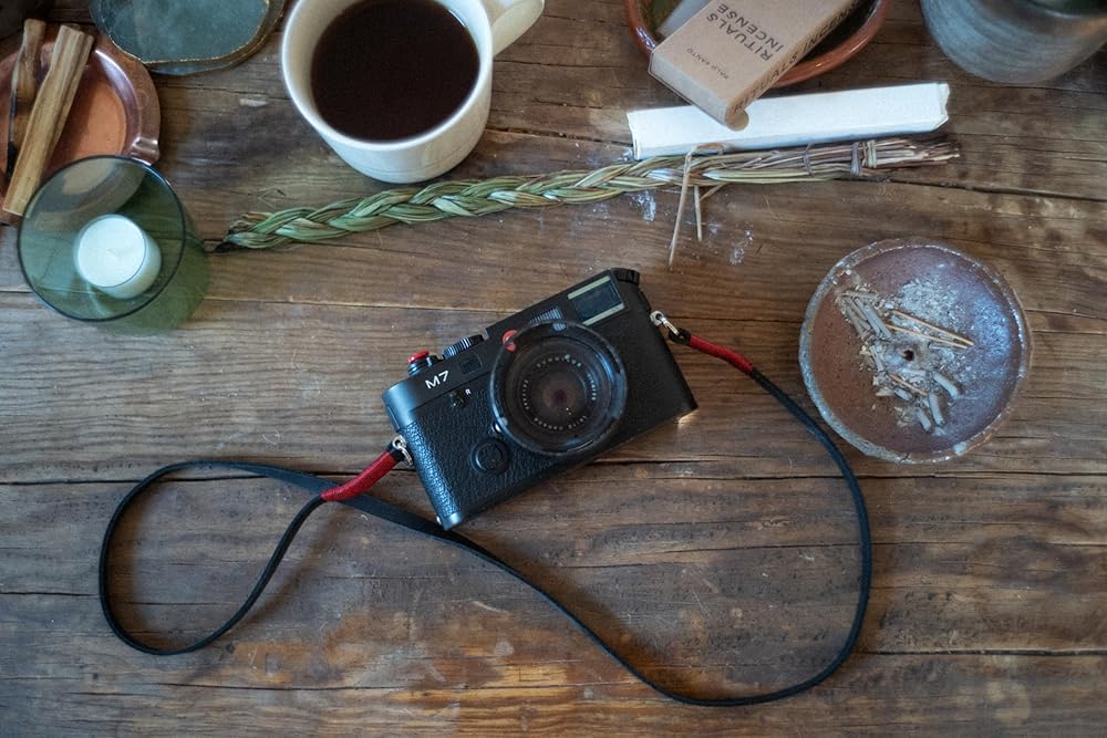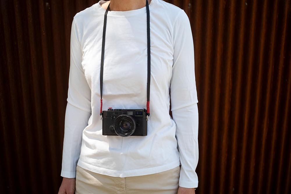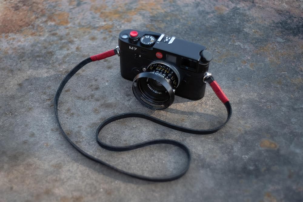 Black slim leather camera strap with red thread wrap on the ends to protect the camera. Perfect for Fuji Film or Leica. The strap is shorter, so it sits a little higher on the chest and allows for quick shooting. It looks and works great with Leica, Fujifilm, and other small mirrorless cameras. Also great for street photography. The strap is slim and flexible so it's easy to also wrap around your wrist while shooting and doesn't get bunched up. Designed by a photographer looking for a simple, slim, and flexible strap for everyday shooting. Designed on purpose to be affordable, unlike so many other straps.