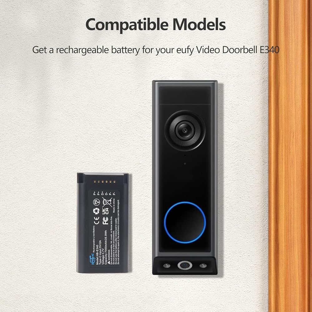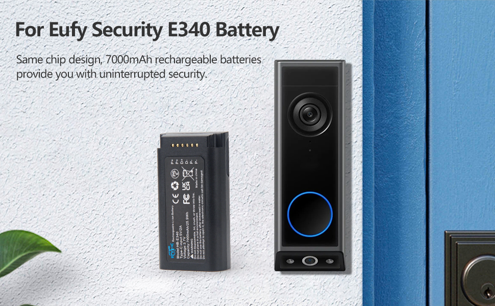 【بطارية مطورة لبطارية eufy E340 】 نوع البطارية: ليثيوم أيون، الجهد الكهربي: 3.7 فولت؛ السعة: 7000 مللي أمبير/25.9 وات في الساعة. خلايا عالية السعة والجودة تجعل جرس الباب بالفيديو Eufy E340 يعمل لفترة أطول.