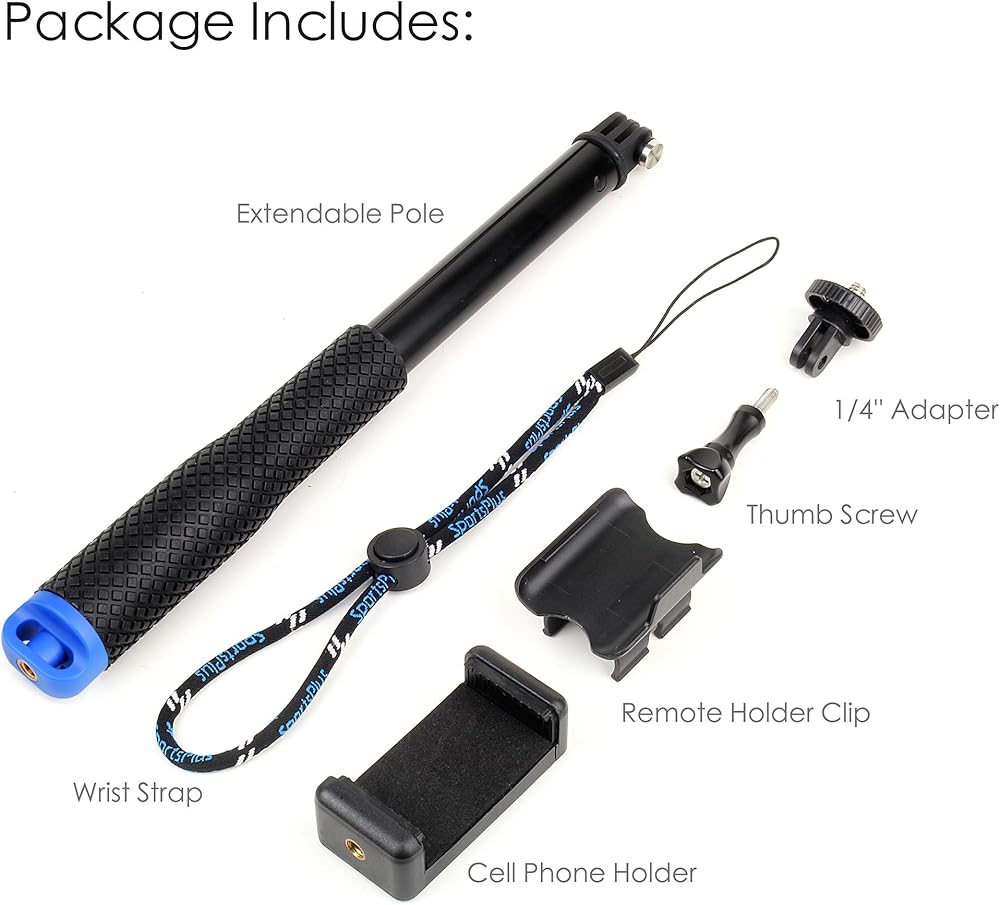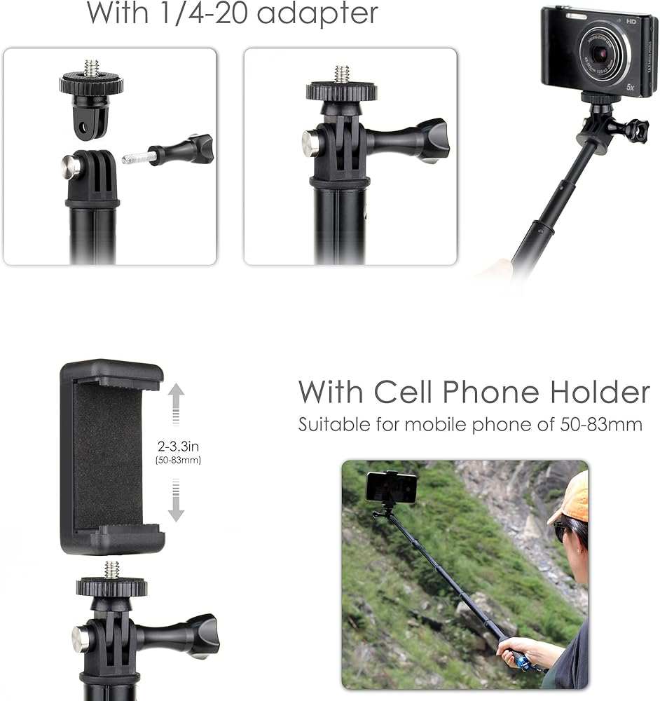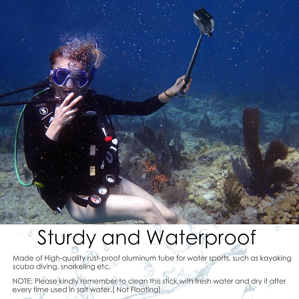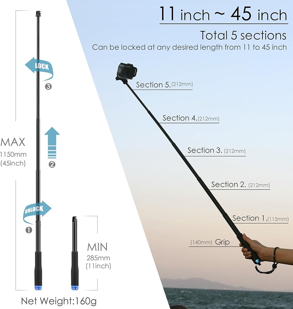 • متين وقابل للتمدد: عمود التمديد مصنوع من سبائك الألومنيوم عالية الجودة ومقاوم للصدأ في المياه المالحة. هناك 5 أقسام:: 11 بوصة (285 مم) عند سحبها، وممتدة حتى 45 بوصة (1150 مم) عند تمديدها بالكامل. يزن 160 جرامًا فقط، وهو محمول وخفيف الوزن للحمل. حامل كاميرا مثالي للأنشطة الداخلية والخارجية مثل التقاط الصور وصور السيلفي والفيديو والسفر وركوب الأمواج والغطس والمشي لمسافات طويلة والتزلج على الجليد والمزيد.