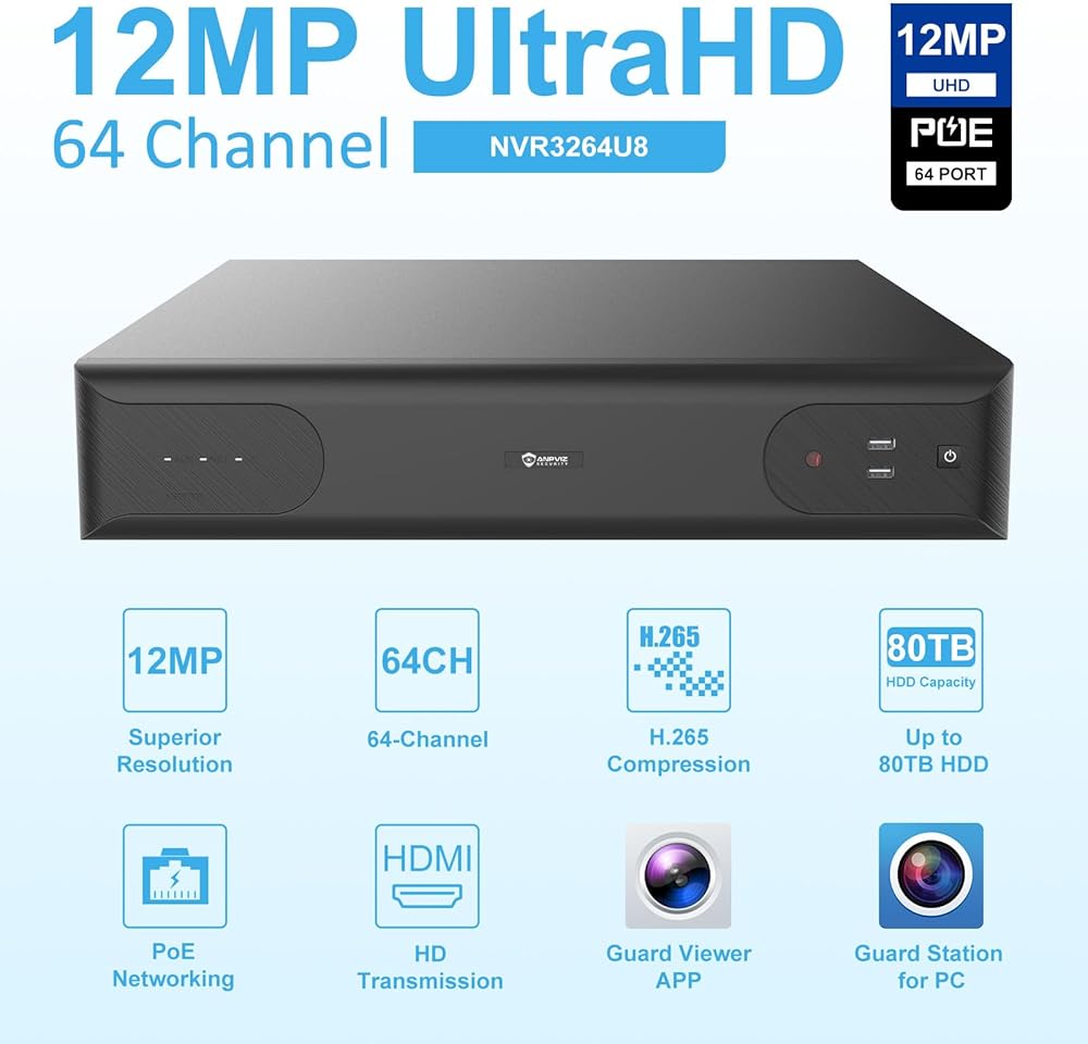Anpviz 12MP 64 قناة PoE NVR مسجل فيديو شبكي مع اكتشاف الإنسان والمركبات، 64CH H.265 NVR تجاري يدعم 12MP/8MP/6MP/5MP/4MP/3MP/1080P IP PoE مسجل صوت فيديو للأعمال