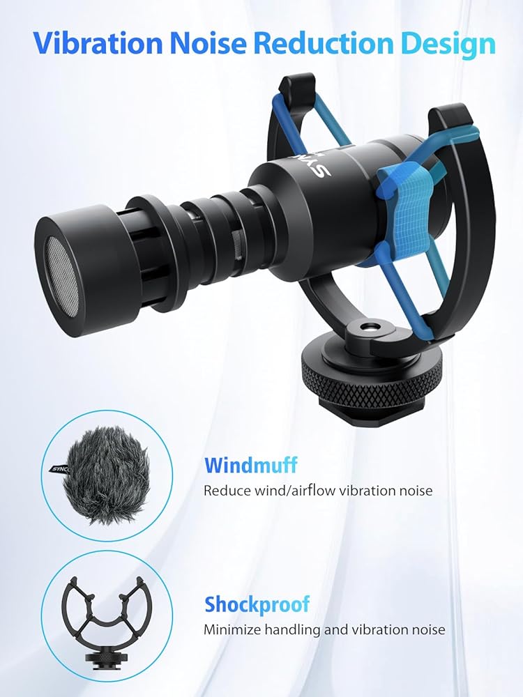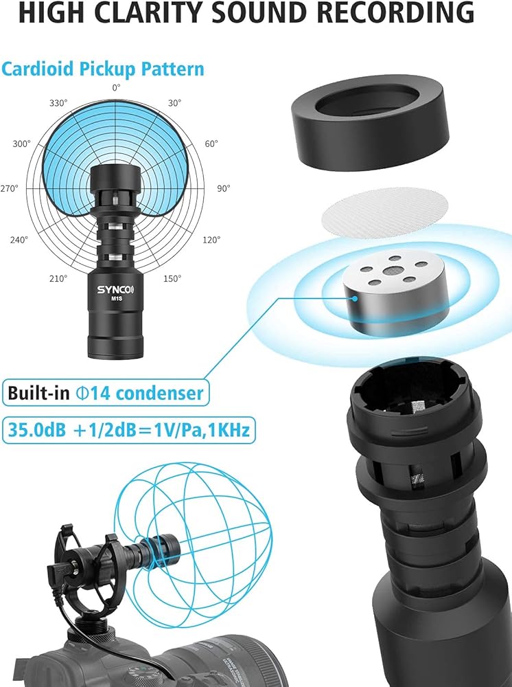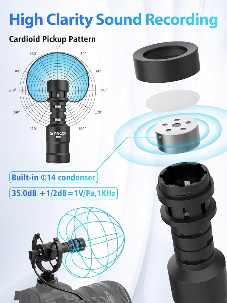 【Cardioid Directional Microphone】Adopting cardioid polar pattern, SYNCO Mic-M2S on-camera microphone precisely collects sound in front of the mic while reducing background noises, especially ideal for clear audio-required recording occasions e.g. vlogging, speech, interview and tutorials.