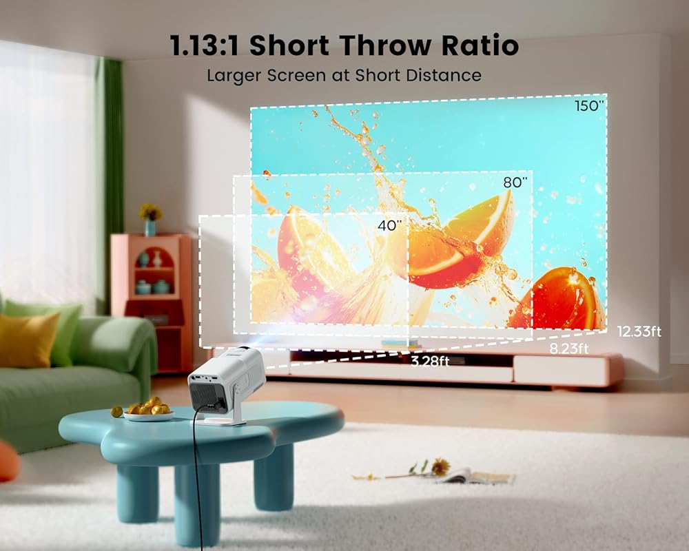 🔥【1.13:1 نسبة عرض ممتازة وتكبير 50%】يتميز جهاز العرض 4K هذا بنسبة عرض ممتازة قريبة من جهاز عرض قصير المدى، والذي يمكنه عرض شاشة مقاس 120 بوصة على مسافة 8.2 قدم، بينما تحتاج أجهزة العرض العلوية الأخرى إلى أكثر من 11.5 قدم. سواء كانت غرفة كبيرة/صغيرة/تخييم/خيمة، بمساعدة وظيفة التكبير/التصغير، يمكنك الاستمتاع بليلة فيلم واضحة على شاشة مقاس 40 بوصة إلى 300 بوصة دون تحريك جهاز العرض 4K (مسافة الإسقاط 2.95-14.76 قدمًا. )