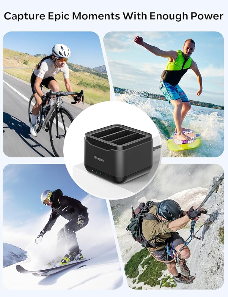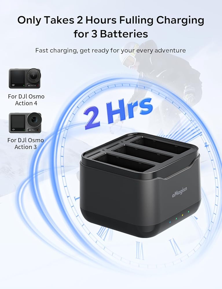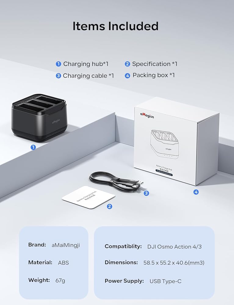 ✅حافظة شحن البطارية لـ DJI Osmo Action 4/3: يمكن لمركز شاحن البطارية السريع DJI Osmo Action 4/3 شحن 3 بطاريات بالكامل بسرعة في وقت واحد بأقصى طاقة خلال 2.5 ساعة فقط، مما يضمن أن كاميرا الحركة DJI Osmo Action 4/3 الخاصة بك دائما قوية. تشمل العبوة: 1 × محور شاحن aMaiMingji DJI Osmo Action 4/3 1 × كابل شحن Tape-C. ❌(ملاحظة: بطاريات DJI Osmo Action 4/3 غير متضمنة)