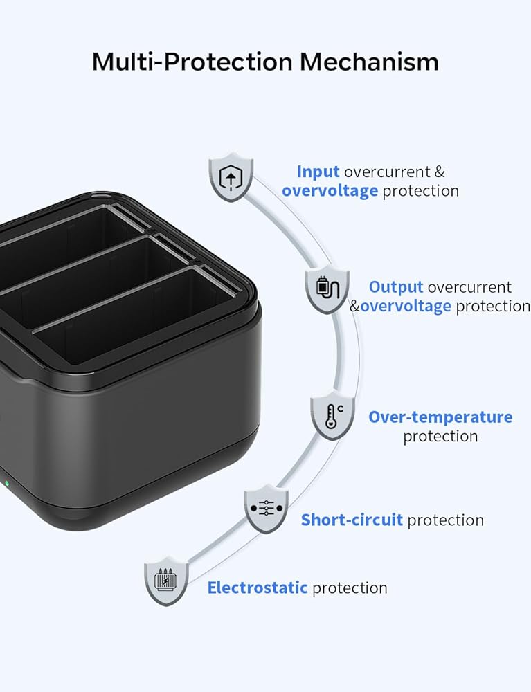 ♻️حماية أمنية ذكية متعددة: تحتوي محطة شحن البطارية DJI Osmo Action 4/3 ذات 3 قنوات على شريحة ذكية مدمجة توفر حماية من الجهد الزائد والتيار الزائد وقصر الدائرة ودرجة الحرارة الزائدة والشحن الزائد البطارية تشحن.