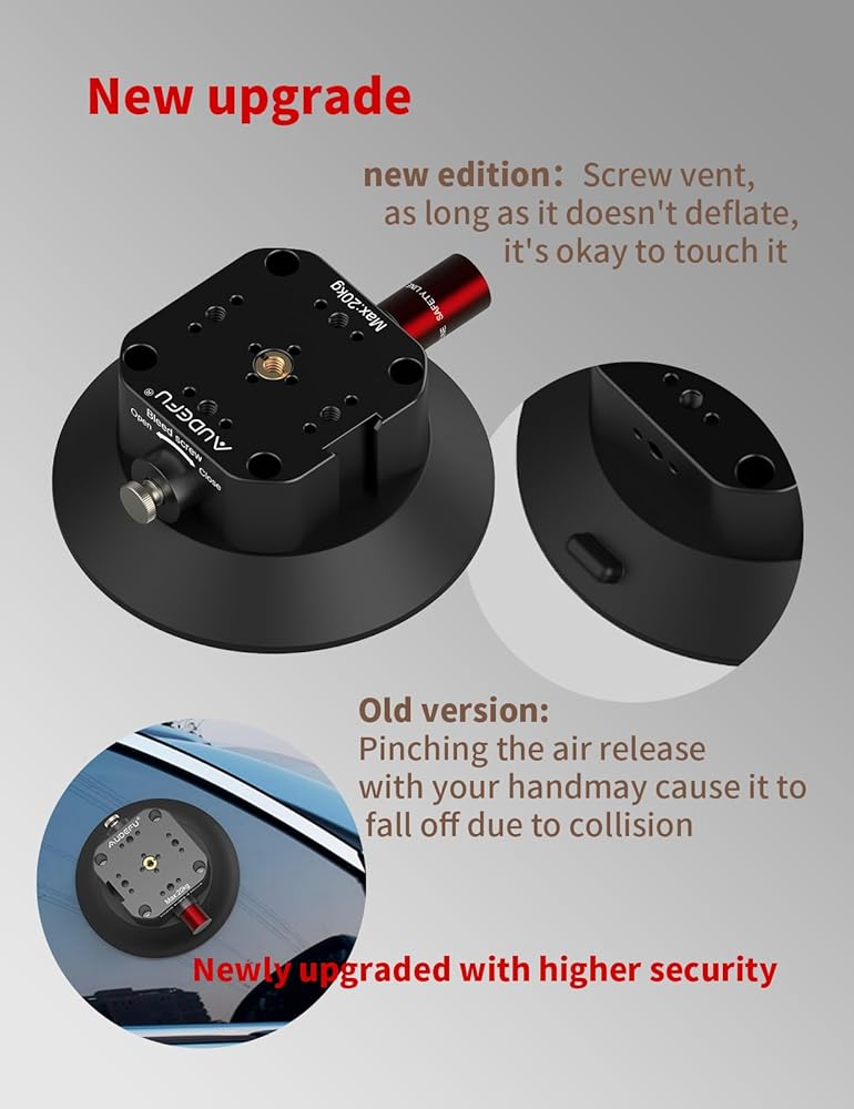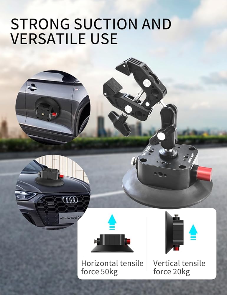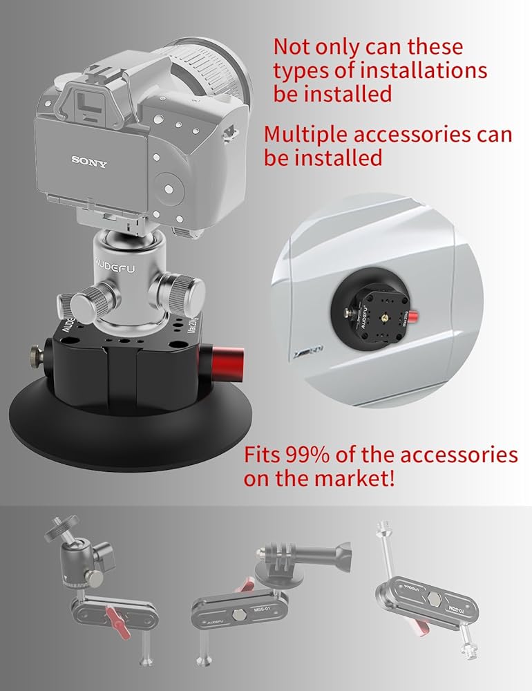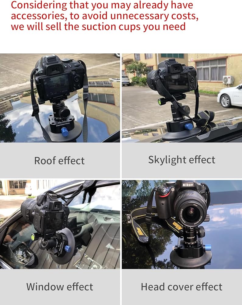[توافق واسع] يحتوي كوب الشفط المتصاعد على خيوط متعددة 1/4"-20 و3/8"-16، وأحذية ساخنة لمصباح فلاش، وفتحات لتحديد موضع الحافة. يمكن توصيله بذراع سحري، والهاتف المحمول، والكاميرا، وكاميرا الحركة، وكاميرا SLR، والمزيد.