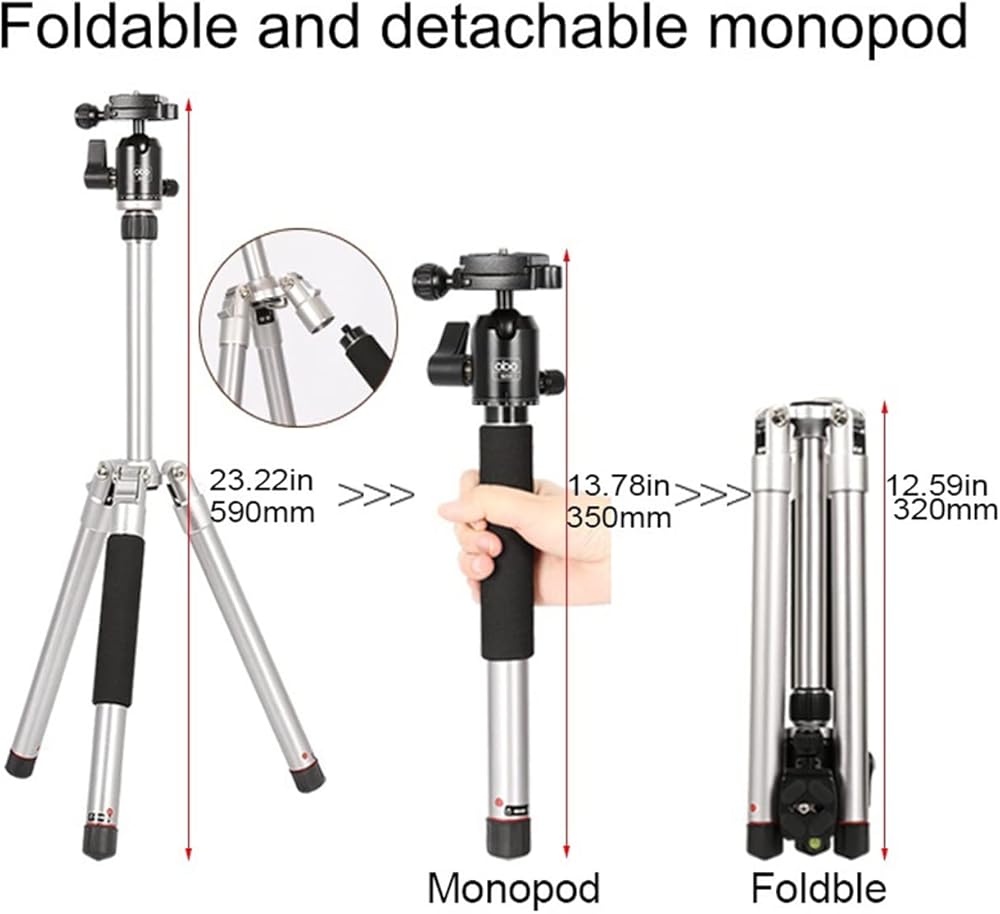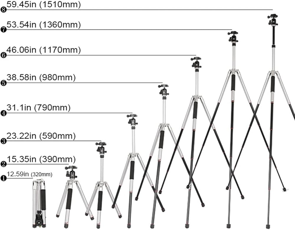 • 【Compact & Flexible】: 5-section tripod legs, easier to adjust shooting angle. Reverse folded length is 12.6”/320mm, storage space is compact. 3-angle adjustment helps you to use this tripod in various situations and capture wonderful moments from different angles