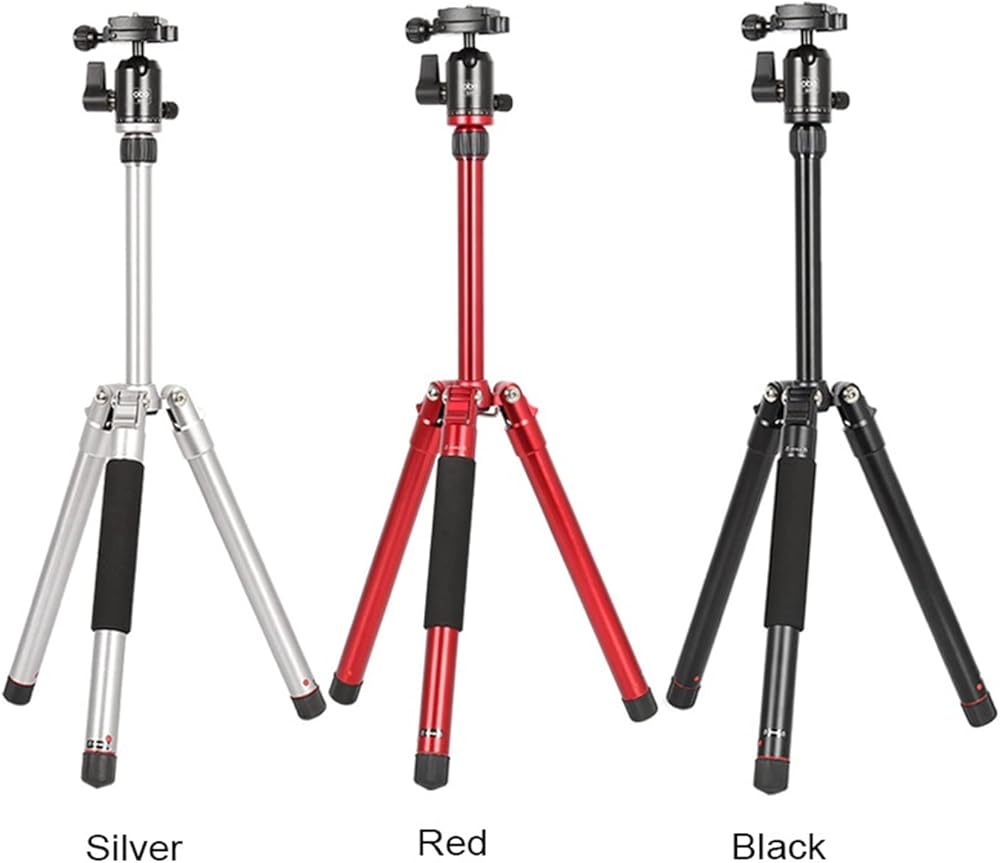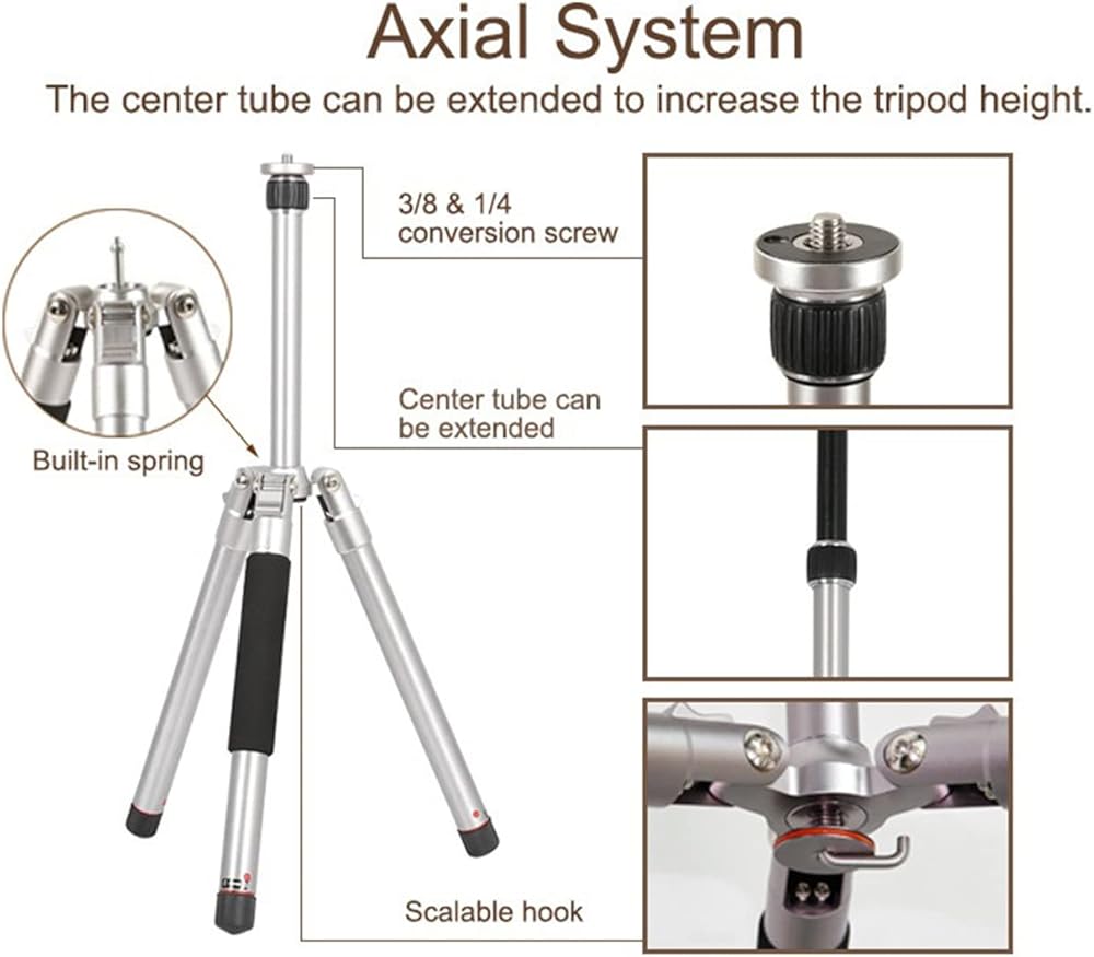 • 【Material & Structure】: The tripod is made of aluminum alloy, weighs only 2.2lbs/1kg with max load 11.1lbs/5kg. The internal lock design is easy and convenient to use. Non-slip rubber feet pads keep tripod sturdy. The detachable center column can be removed to have a lower shooting angle