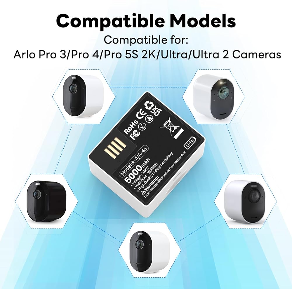 ✔️[الأمان والموثوقية] تساعدك شريحة التحكم الذكية المدمجة على استخدام البطارية المتوافقة مع Arlo Pro 5/5S 2K/Arlo Pro 3/Pro 4/Ultra/Ultra 2 بشكل أكثر أمانًا (الشحن الزائد، التفريغ الزائد، الإفراط في الشحن). الجهد الكهربي والتيار الزائد والحماية من الحرارة الزائدة)، يضمن الحماية الكاملة لك ولأجهزتك