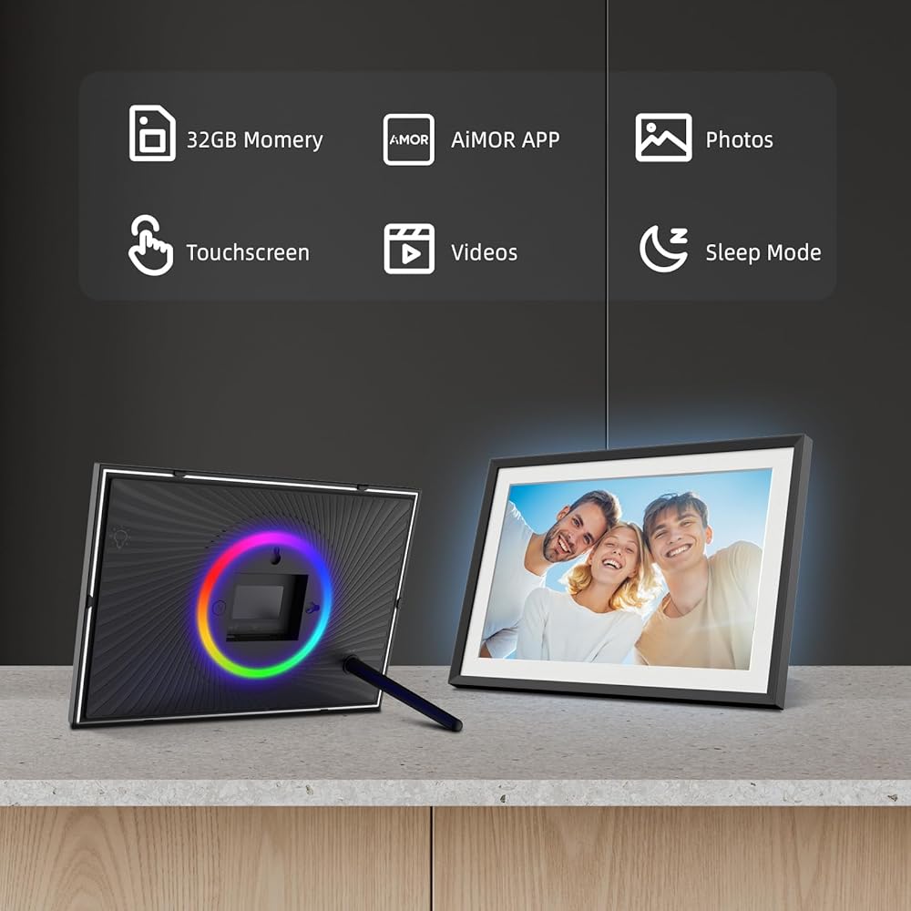 إطار صورة رقمي AEEZO مقاس 10.1 بوصة إطار صور رقمي WiFi مع ضوء LED، شاشة لمس عالية الدقة 1280 * 800 IPS إطار صور إلكتروني ذكي مع مساحة تخزين 32 جيجابايت، مشاركة الصور أو مقاطع الفيديو عبر تطبيق AiMOR