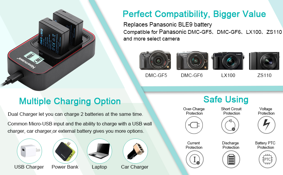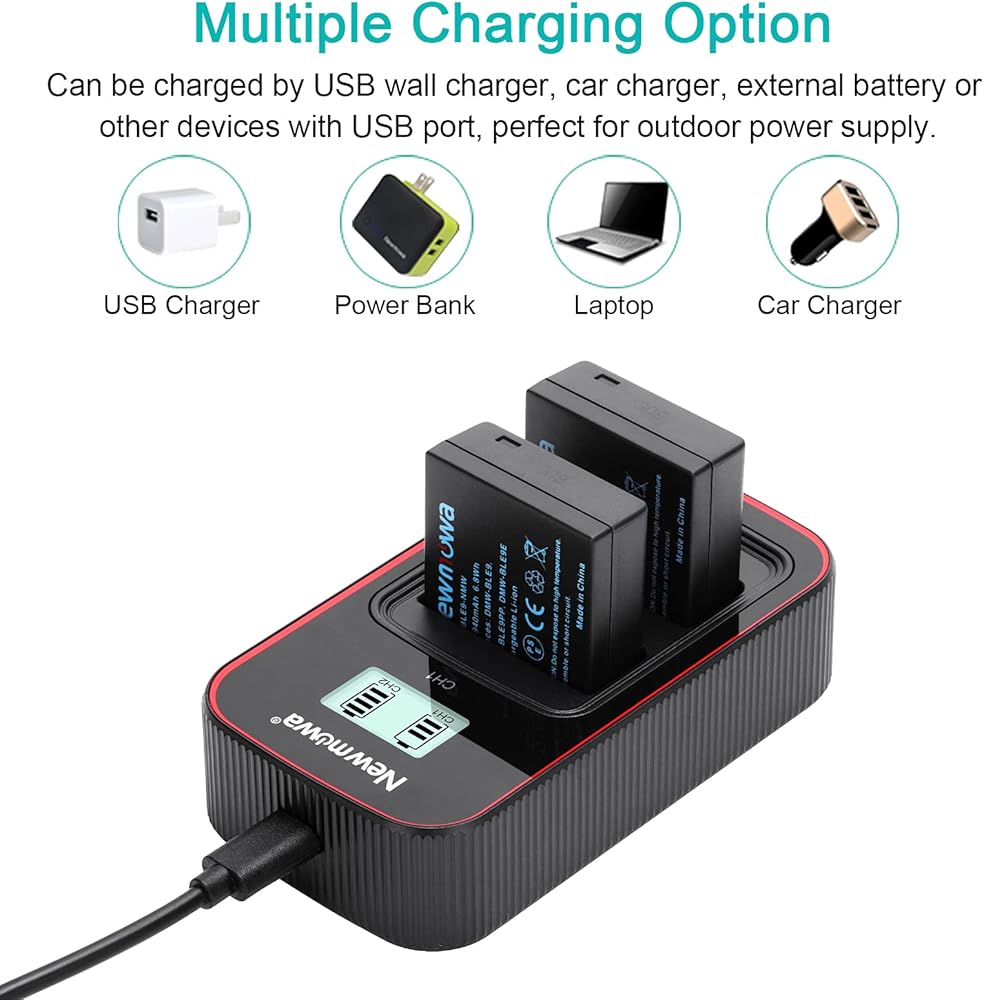 السعة الدقيقة: تتميز كل بطارية DMW BLE9 بقدرة 7.2 فولت، و940 مللي أمبير في الساعة، وثلاثة أضعاف وقت تشغيل الكاميرا مع حزمة احتياطية كاملة تتضمن بطاريتين بديلتين وشاحن USB مزدوج بشاشة LCD ذكية