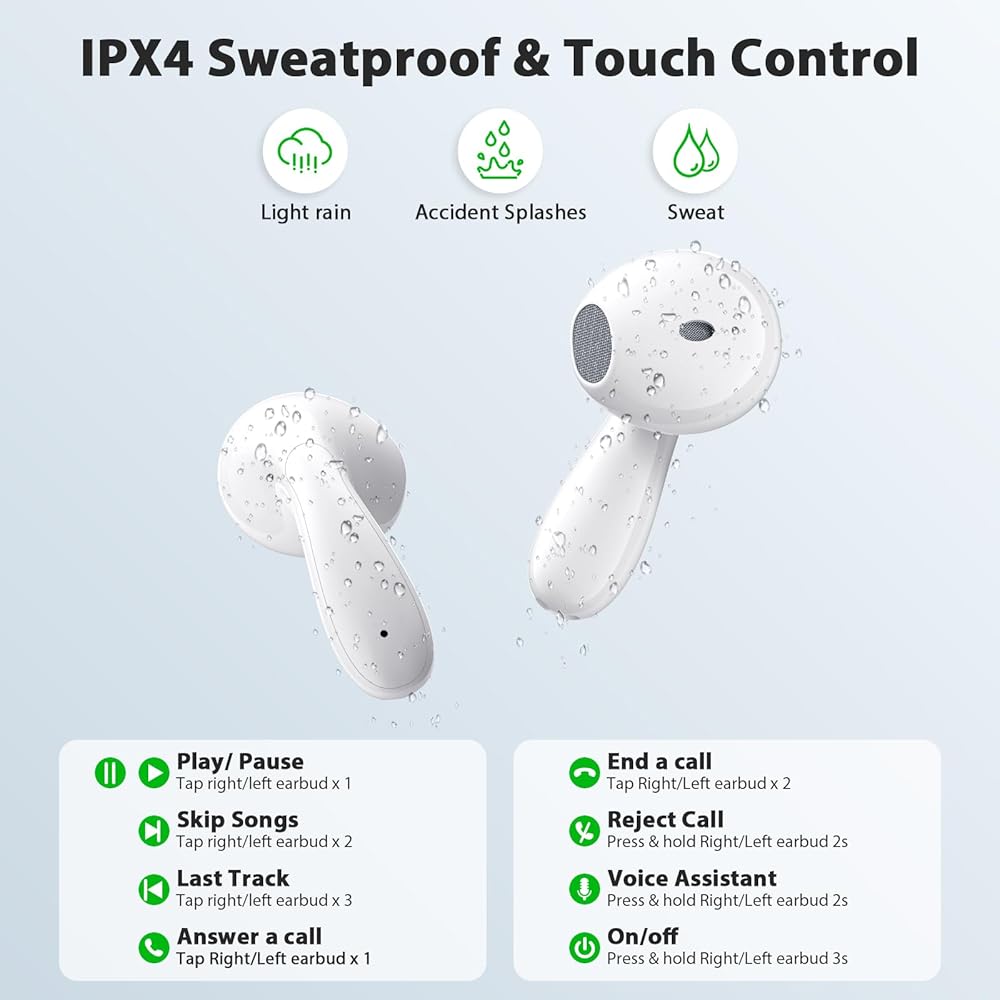 مقاومة للماء بدرجة IPX4 وتحكم ذكي باللمس: يمكن لسماعات الأذن TWS المقاومة للماء بدرجة IPX4 أن تقاوم العرق والمطر بسهولة، حتى لو هطلت الأمطار. وظيفة التحكم الذكية باللمس تجعل الحياة أكثر ملاءمة للرد على الهواتف، وتبديل الأغاني وتنشيط المساعد الصوتي دون تشغيل هاتفك بشكل متكرر، والتحكم بسهولة عن طريق نقرة بسيطة على سماعات الأذن. المس منطقة المستشعر لتحقيق وظائف متعددة بما في ذلك تخطي المسارات/التشغيل/الإيقاف المؤقت وما إلى ذلك.