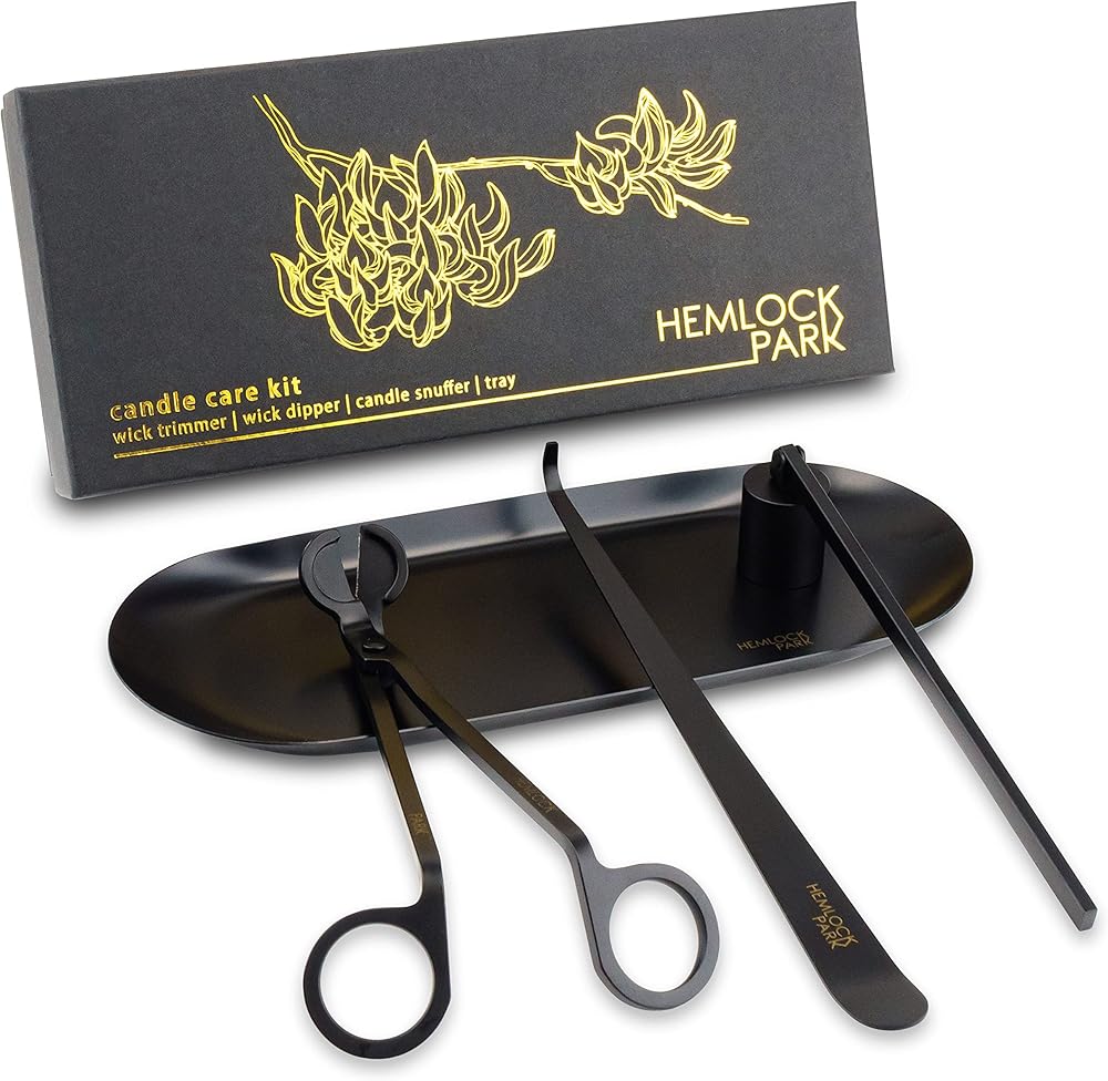 هيملوك بارك 4 في 1 مجموعة العناية بالشموع | قطاعة تشذيب فتيل الشموع، طفاية إطفاء الشموع، غطاس الفتيل، صينية معدنية في صندوق هدايا (أسود)