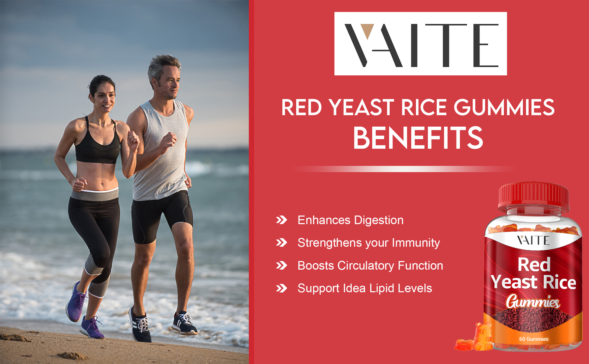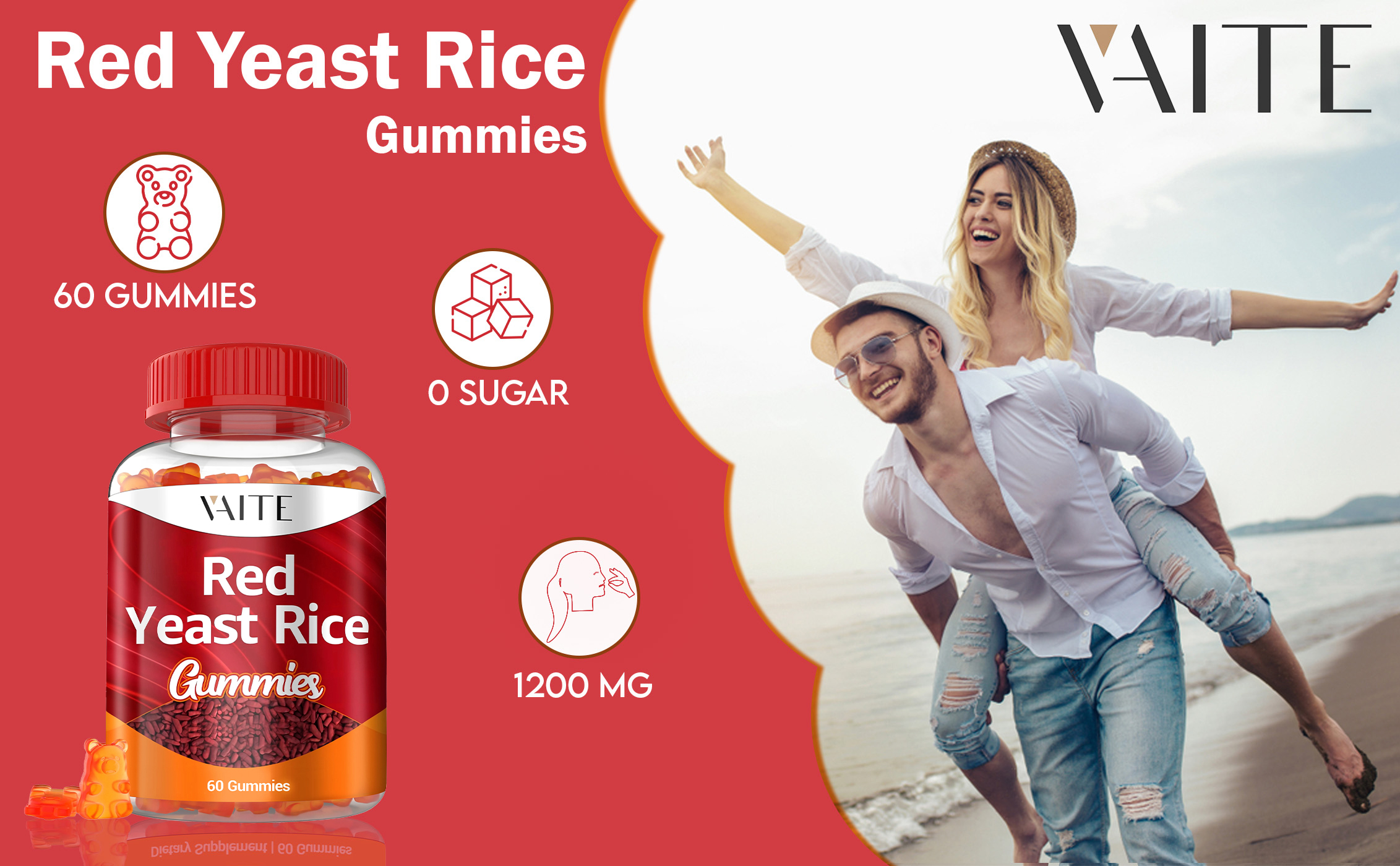 VAITE أرز الخميرة الحمراء مع Coq10 Gummies - 1200 مجم RYR مكمل عضوي مع الإنزيم المساعد Q10 Monacolin K لارتفاع نسبة الكوليسترول وغير معدل وراثيًا وخالي من السيترينين، مضغ نباتي عشبي 60 قطعة