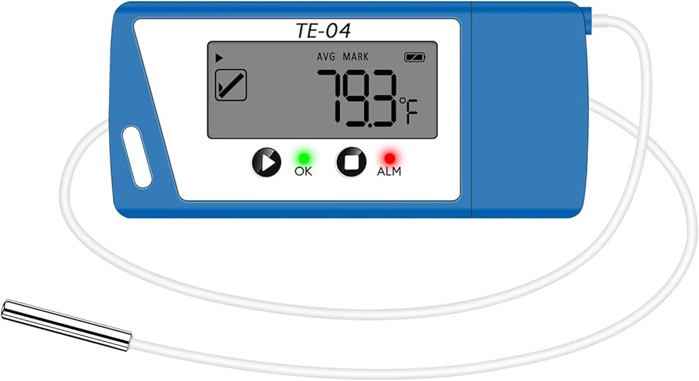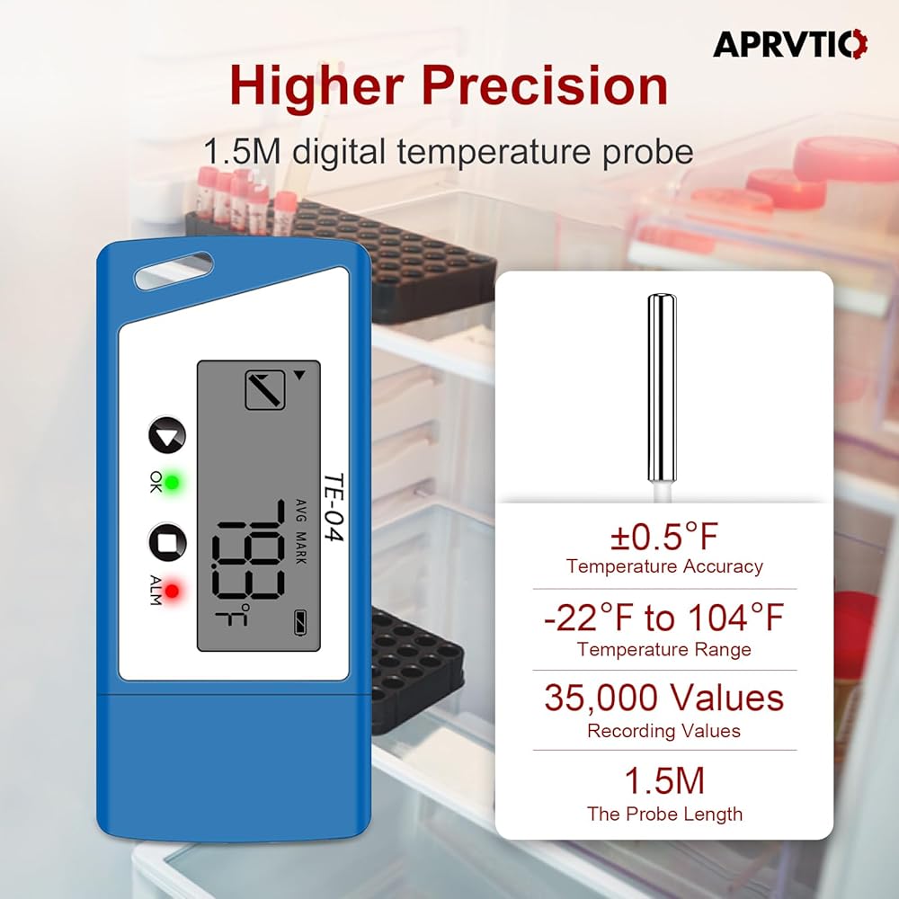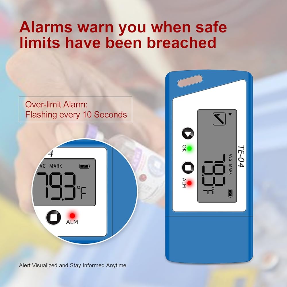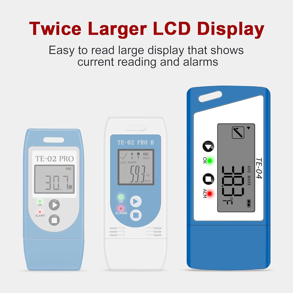 مسجل بيانات درجة الحرارة TE-04 مع مسبار خارجي 1.5 متر، تقرير PDF وCSV تلقائي، 35000 نقطة، وظيفة تسجيل الإيقاف المؤقت للشاشة الكبيرة، مسجل درجة الحرارة لتخزين لقاحات الشحن بسلسلة باردة