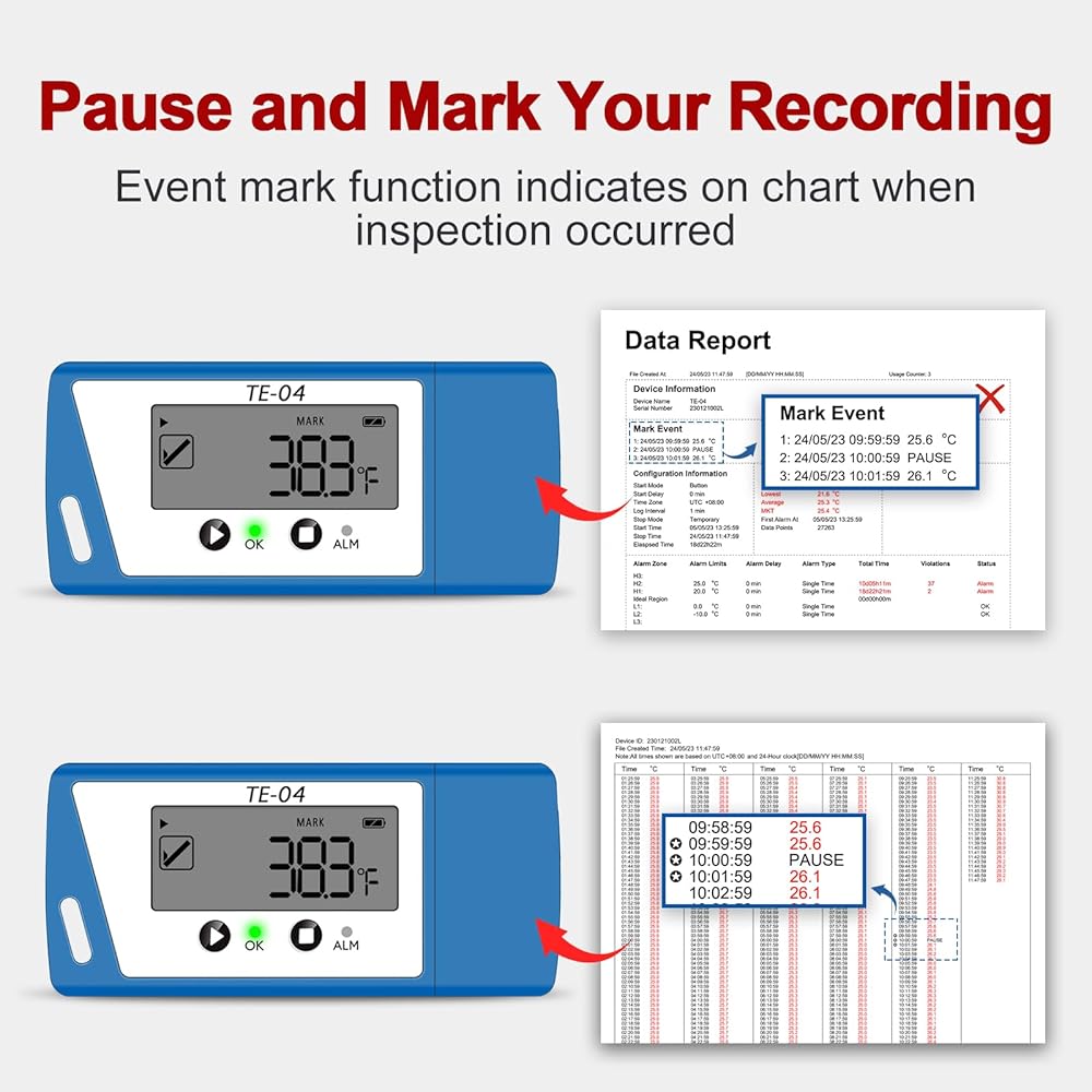 【إيقاف مؤقت ووضع علامة على التسجيل الخاص بك】يأتي مسجل بيانات درجة الحرارة بتنسيق PDF مزودًا بوظائف العلامة والإيقاف المؤقت لمراجعة الإحصائيات أو مسح الإنذارات دون تسجيلات غير صالحة. ويمكن إعادة تشغيله بالضغط على الزر، دون الحاجة إلى برنامج.