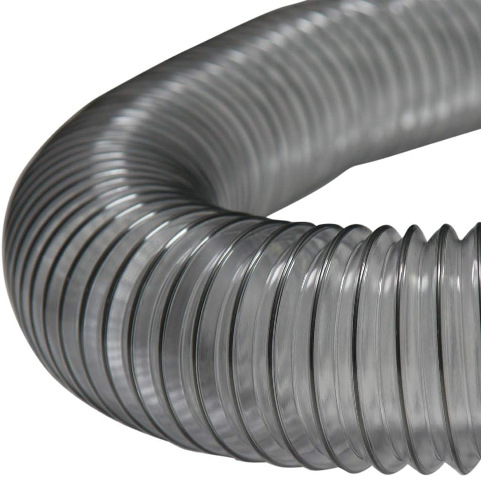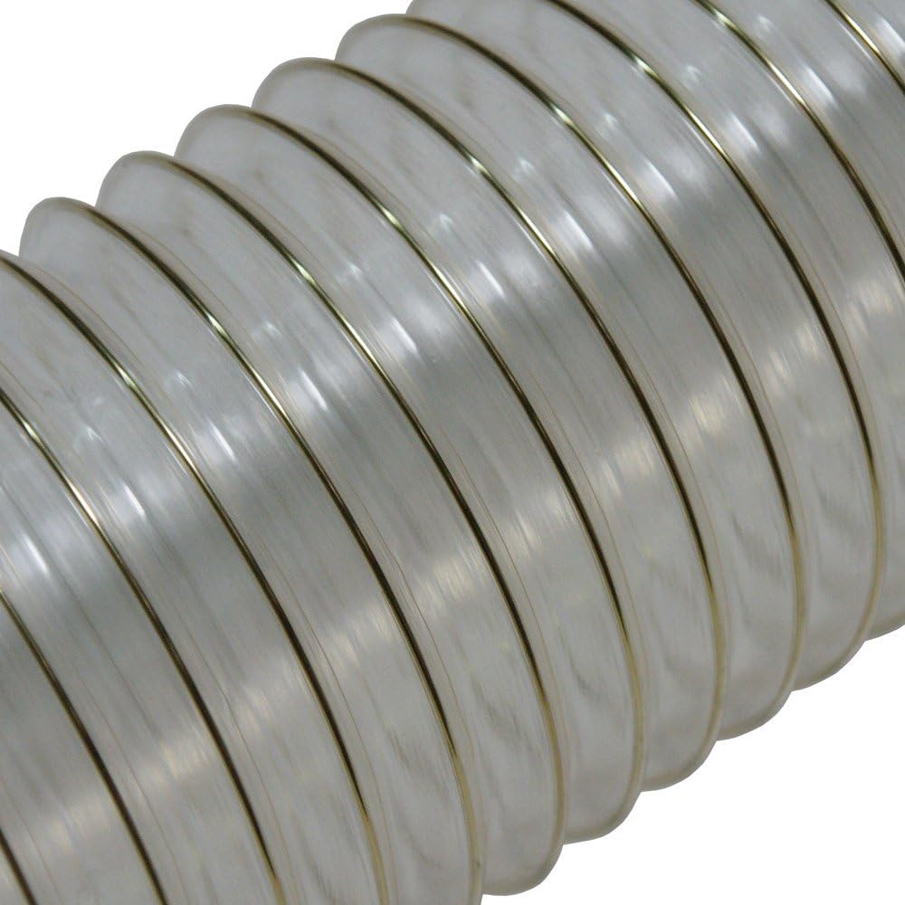The "PVC Flexduct Light-Duty Clear" is a medium-weight clear PVC flexible hose reinforced with a spring steel wire helix for industrial air movement and fume control applications. These commercial flexible hoses provide great flexibility with tight bending characteristics and offer good chemical and dampness resistance. This flex ductwork is great for applications where ventilation and flexibility are a must. PVC hose material is an amorphous polymer and as a result its basically transparent. PVC flex hoses are non-transparent when they are manufactured using compounding agents. Since the main chain of the polymer is made by single bonds of carbon atoms, PVC has excellent chemical resistance. The "PVC Flexduct Light-Duty Clear" light-duty flex hose has a working temperature range from -20 to 160+ Fahrenheit. These commercial hoses are manufactured with FDA acceptable materials that can be used in food processing, pharmaceutical, and health care applications. PVC has polar groups (chlorine), and is amorphous, therefore mixes well with various other substances. This makes for a chemically stable flex duct. This flexible hose exhibits excellent flexibility and compressibility. In larger ID sizes it has up to a 6 to 1 compression ratio, meaning a 12 foot length can compress down to 2 feet. In addition the smaller sizes of this hose (2.25" and below) can handle a full vacuum at 29 Inch/Hg. Please refer to the product specification guide for exact information regarding the ID size you are considering. The "PVC Flexduct Light-Duty Clear" are general-purpose collections ducts that are available in internal diameter sizes from 1.25" up to 24" ID. These are also available in metric sizes. These air, dust and light material collection ducts are available in clear in standard 12.5 ft and 25 ft sections and come with plain cut ends.