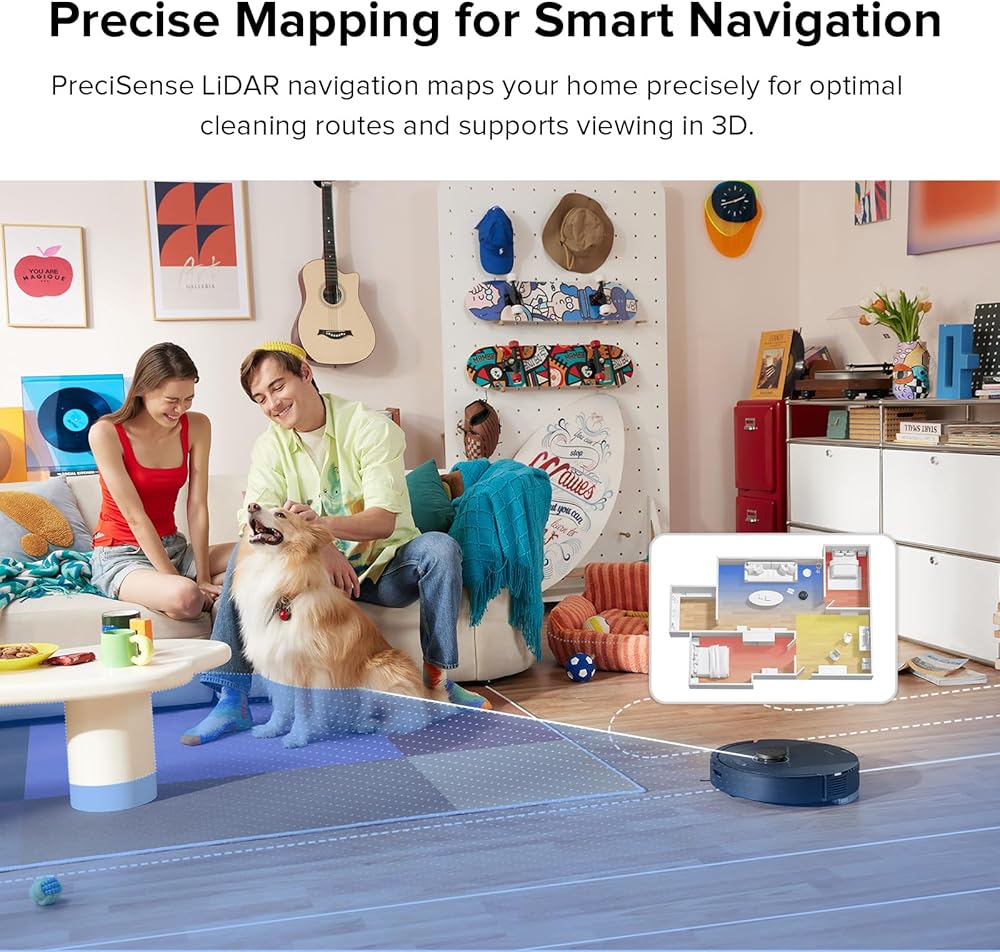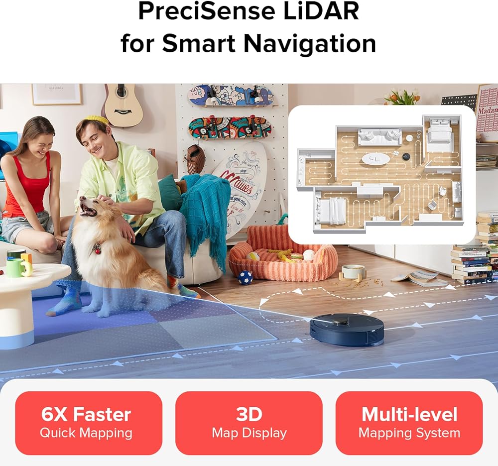 [تقنية التنقل الدقيق ورسم الخرائط]: يمكنك التنقل ورسم مساحتك بدقة باستخدام نظام الملاحة PreciSense LiDAR، الذي يوفر إمكانات رسم الخرائط السريعة ورسم الخرائط ثلاثية الأبعاد ورسم الخرائط متعدد المستويات لإنشاء طريق التنظيف الأمثل لراحتك.