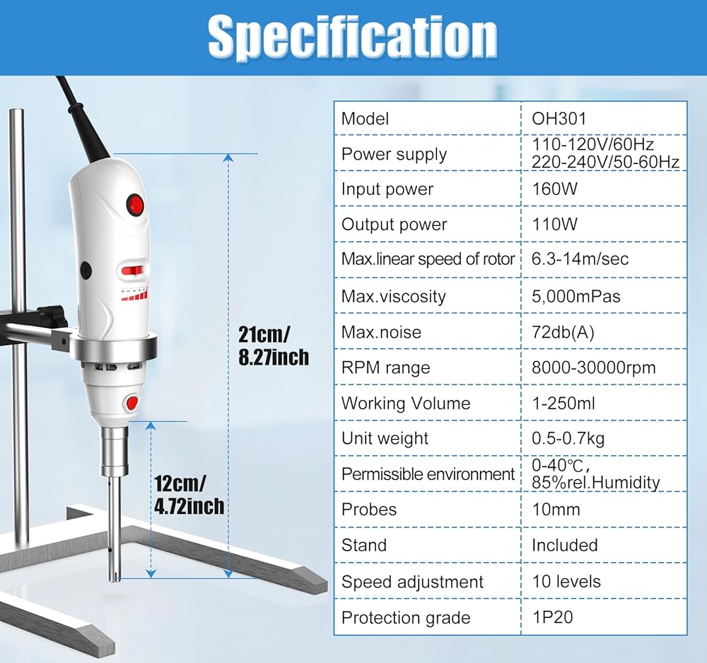مسبار قوي: يأتي هذا المتجانس المحمول مع مسبار (القطر: 10 مم) مصنوع من الفولاذ المقاوم للصدأ 316L عالي الجودة، وهو مقاوم للتآكل وقابل للتعقيم. إن قابلية التبديل سهلة الاستخدام تجعل التنظيف أمرًا سهلاً.