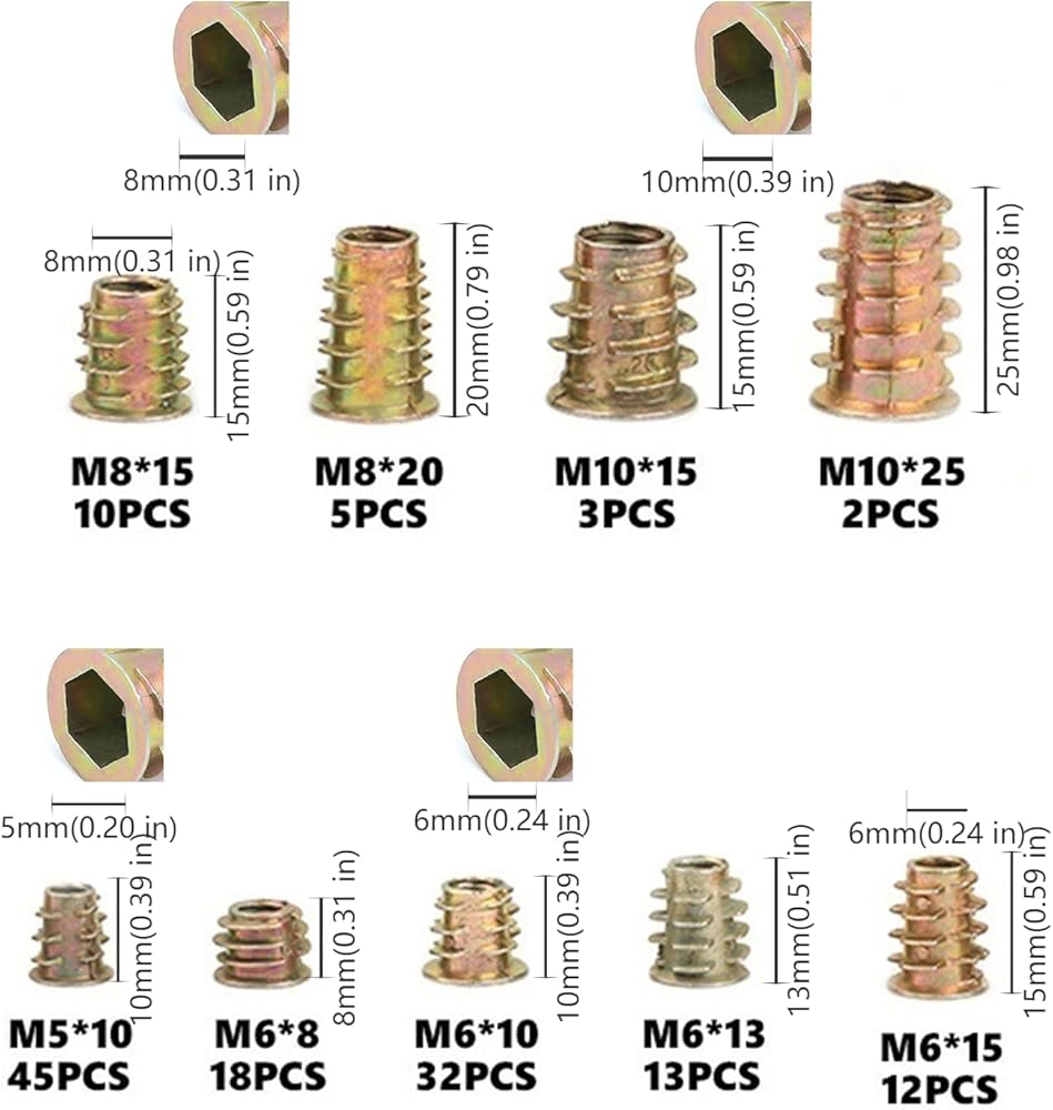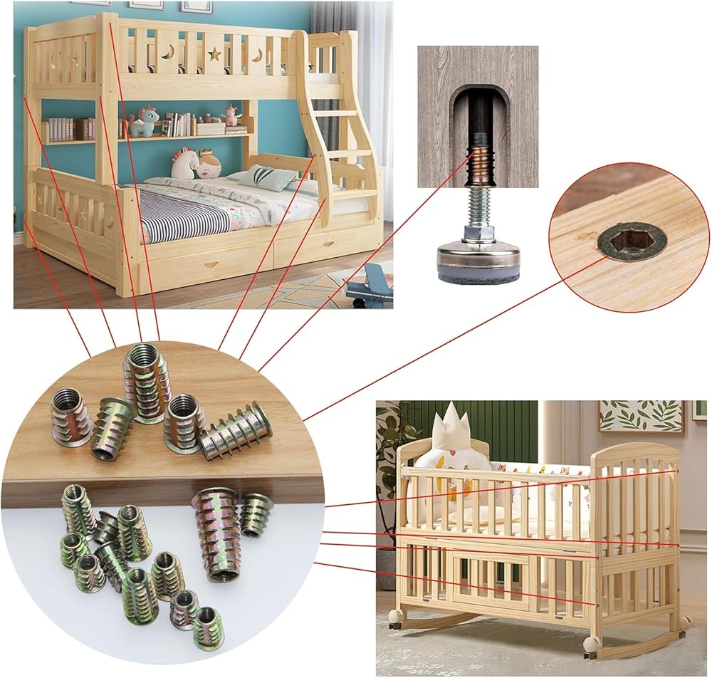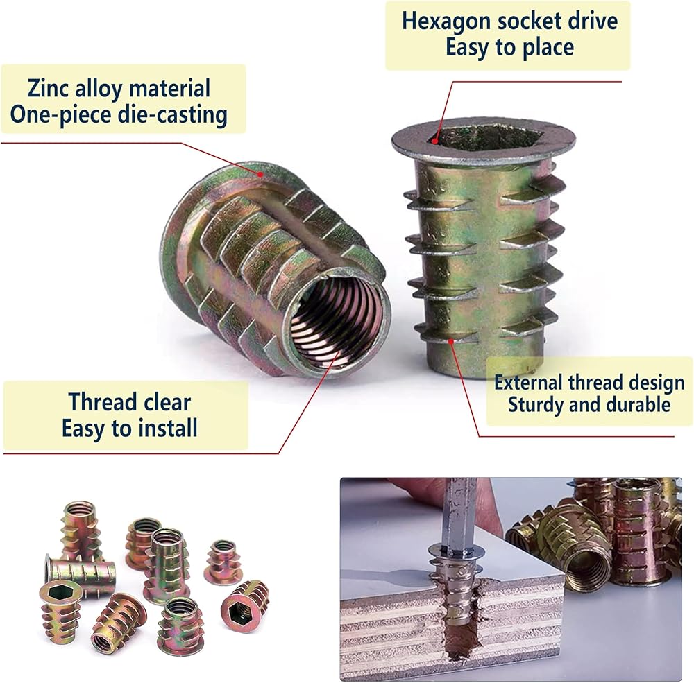 Easy to install: These threaded inserts are inserted into pre drilled holes by screwing them in, in which case the external protrusions will bite into the wood, preventing the nut from turning or pulling out.
