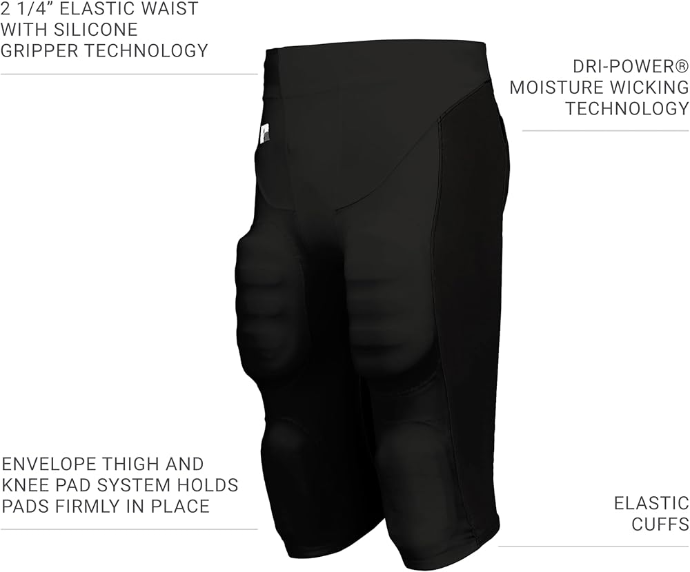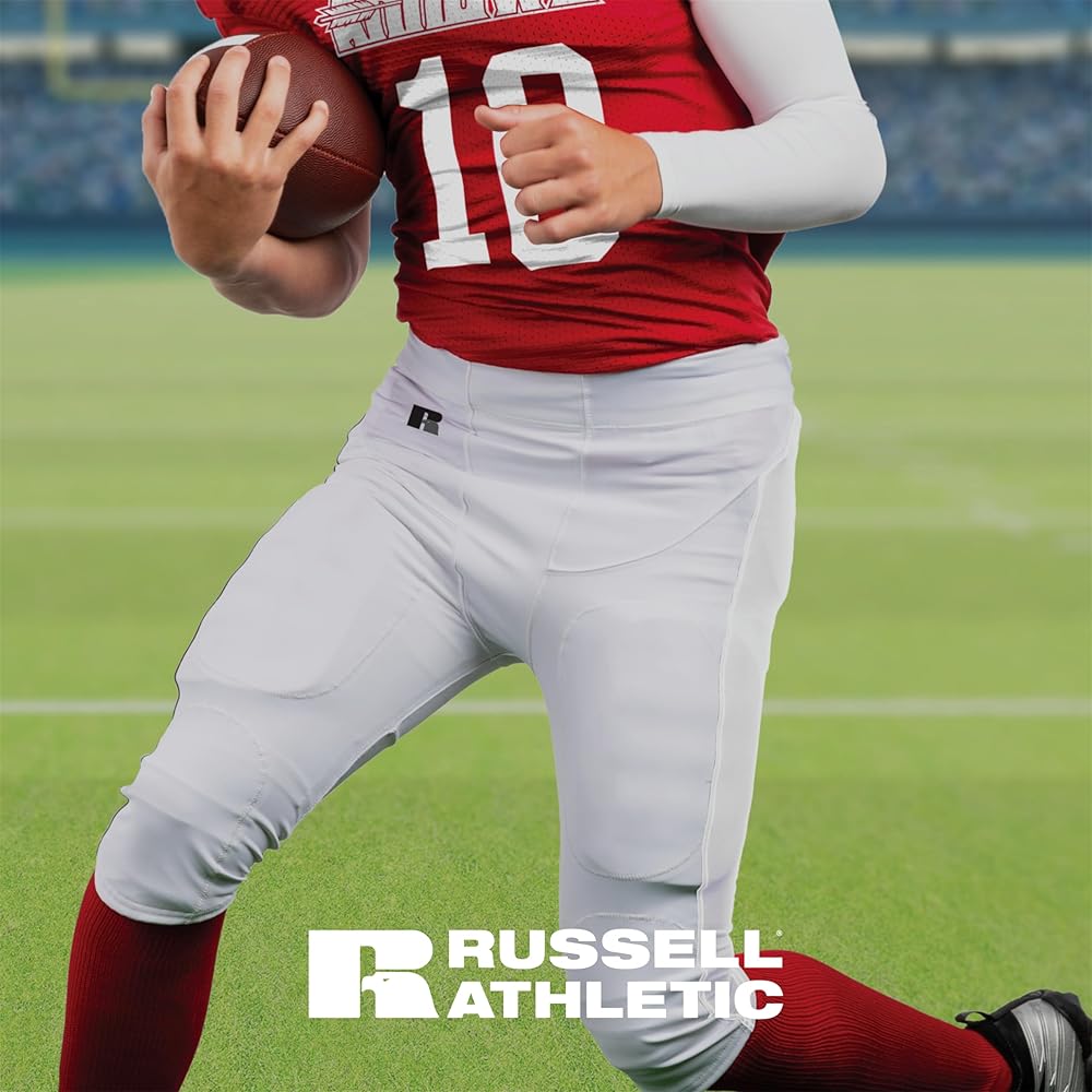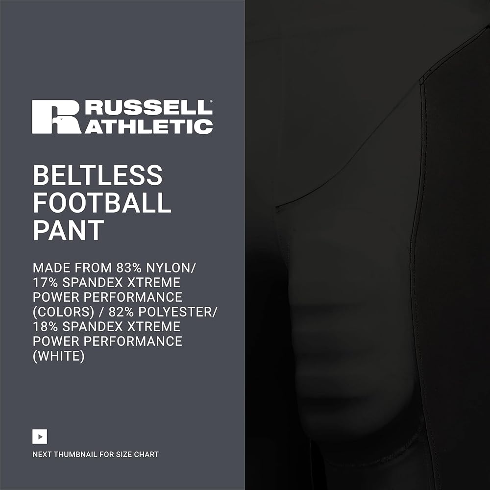 Step up your game with the Beltless Football Pant from Russell, engineered with top-notch features for optimal performance. Crafted from a blend of 83% Nylon and 17% Spandex Xtreme Power Performance fabric in vibrant colors, or 82% Polyester and 18% Spandex Xtreme Power Performance fabric in classic white, these pants offer exceptional durability and flexibility. Experience enhanced breathability with strategically placed mesh inserts at the back yoke and back of the knee, while the innovative Dri-Power® Moisture Wicking Technology keeps you dry and comfortable throughout the game. Say goodbye to unwanted odors, thanks to the built-in odor protection. The 2 1/4" elastic waist, equipped with silicone gripper technology, ensures a secure, tucked-in fit. Adjustability is at your fingertips with the convenient inside drawcord, while the no-fly front design adds a streamlined touch. With the envelope thigh and knee pad system, your pads stay firmly in place, allowing you to focus on the game. Complete with elastic cuffs, these football pants provide a snug and secure fit.