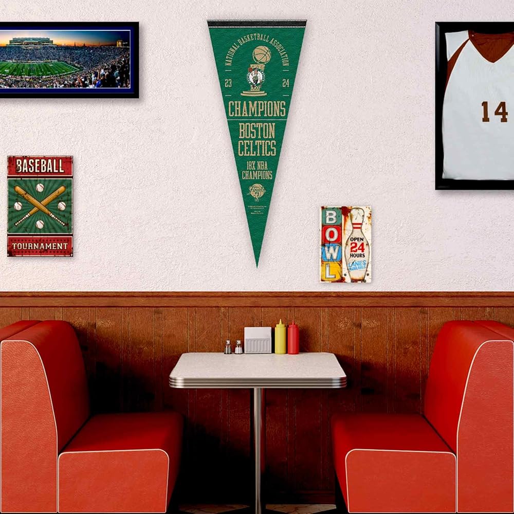 Our Champs Pennant is a great way to show your League allegiance in your sports room, game room, office, bedroom, or any room by displaying on any wall as a banner. These Pennant Flags measure a full size 12 in X 30 in, are made of Felt Wool Blend, and are single-sided Screen Printed with the insignias and logos, as shown. Each Flag, Banner or Pennant is Officially Licensed by the selected team which insures current insignias, wordmarks, and authentic colors. The League pennants also include a pennant sleeve on the left side which can be used to insert a pennant stick, if desired.
