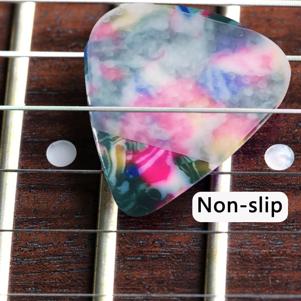 【Premium Materials】The guitar picks grip is made of soft and elastic silicone that feels a perfect touch when used. Guitar picks are made of 0.71mm celluloid, which is resistant to wear and wear, and is durable.