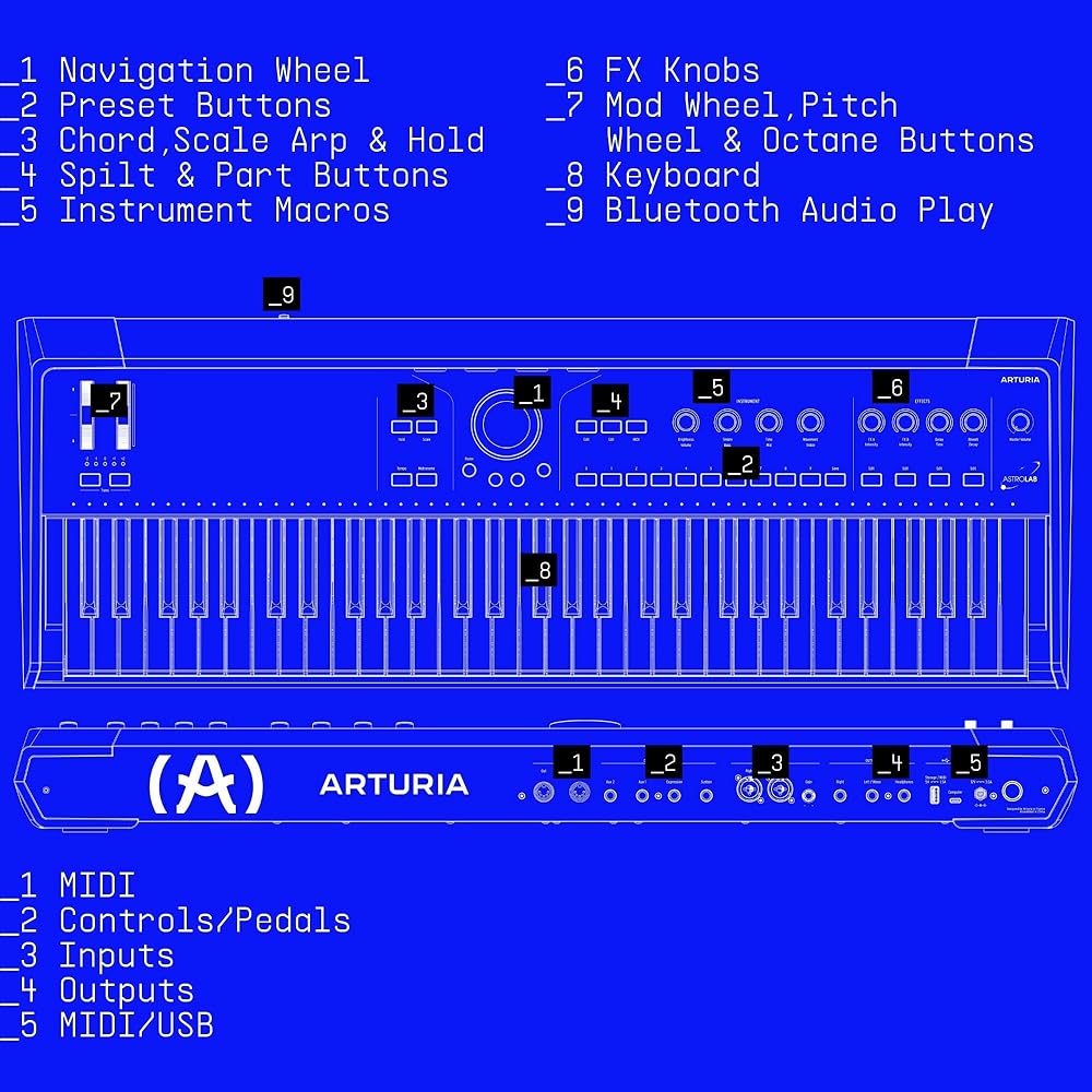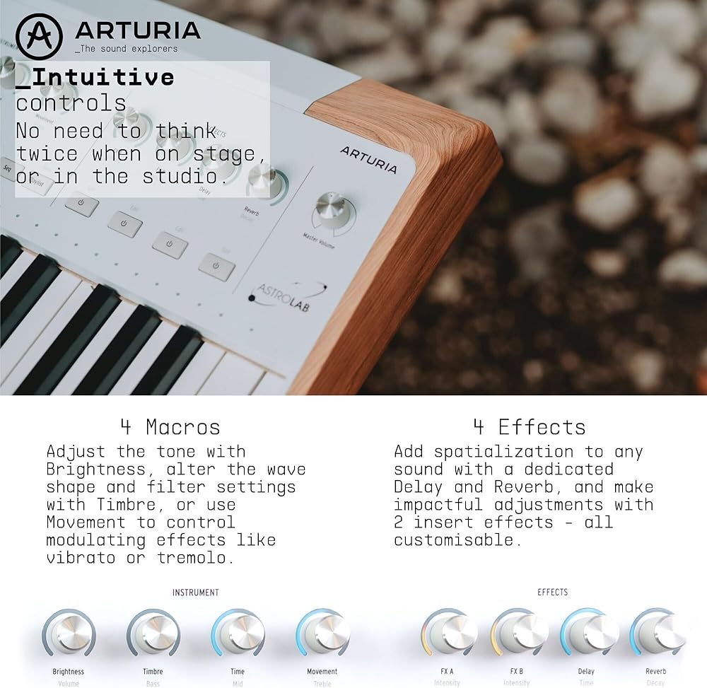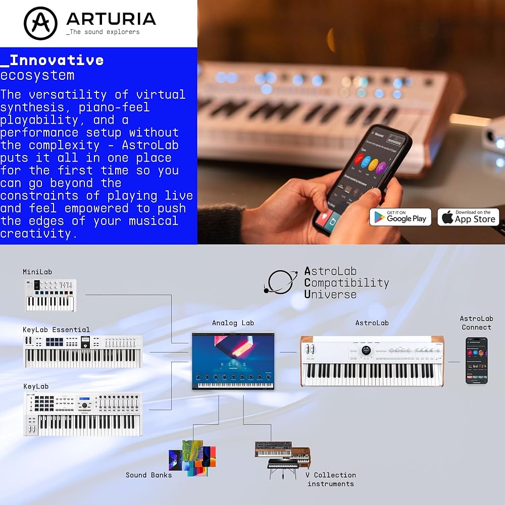 The Arturia AstroLab is the culmination of 25 years of passion, innovation, and commitment to the pursuit of unhindered musical exploration. An instrument that encapsulates everything Arturia ever wanted to achieve, from the seamless fusion of software and hardware, the magic of finding the perfect sound, to the feeling of absolute creative freedom. AstroLab bridges the gap between production and performance, letting you access all your sounds in a reliable, robust, and intuitive way. Arturia's award-winning Phi and TAE technology is built-in, giving you access to 33 instruments from V Collection and Pigments comprising over 1000 preloaded sounds, and the ability to import, combine and curate your own. For many musicians and producers who utilize a plethora of tools, instruments, and custom sounds in their home or studio setup, recreating this for a live performance is not always straightforward. This is where AstroLab comes in, offering both a robust, minimalist design and workflow-focused technology that lets you integrate all your sounds effortlessly. AstroLab comes with over 1000 onboard presets specifically designed for live performance. It also allows you to integrate a near-infinite range of custom sounds through Analog Lab, V Collection, and Pigments.