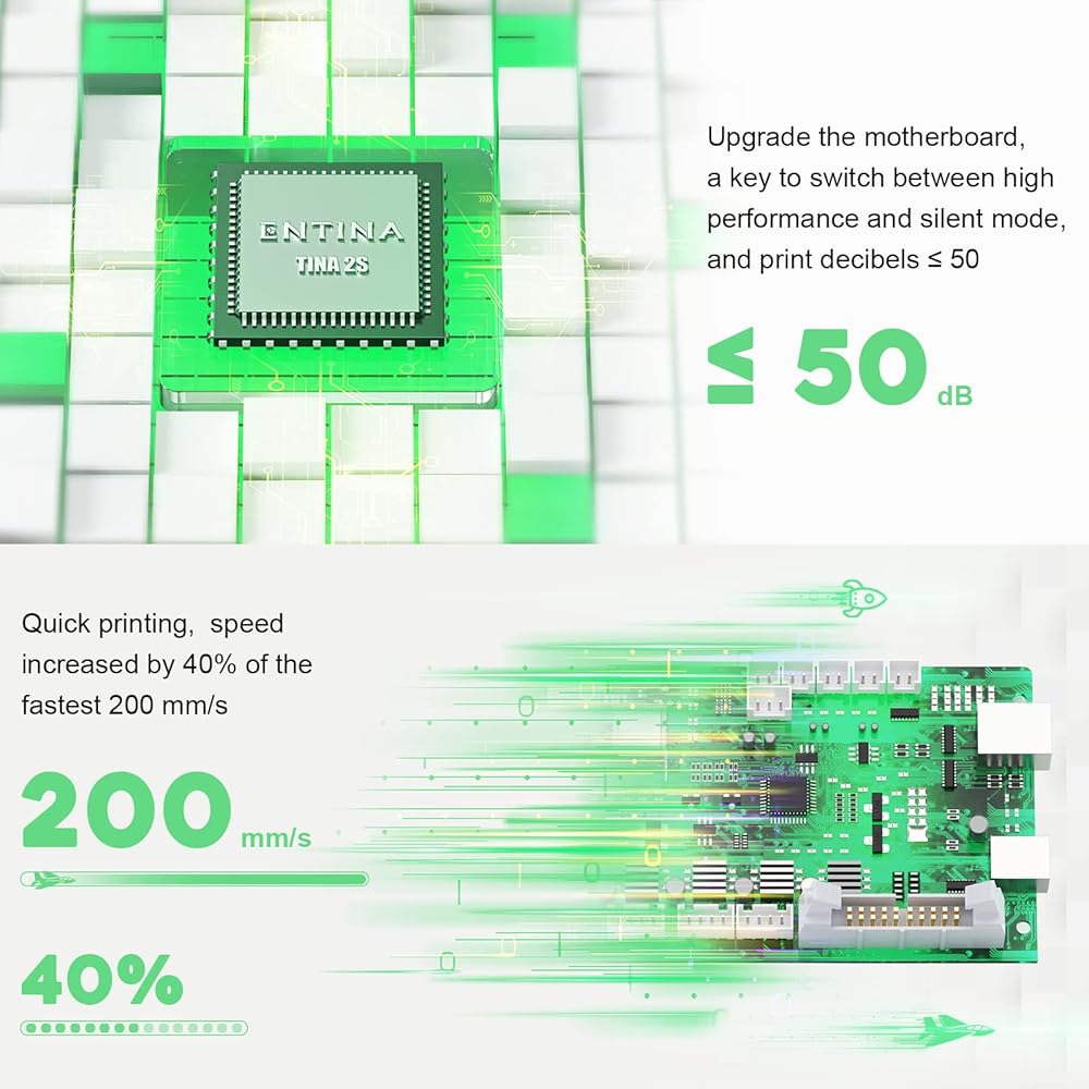 بيئة طباعة فائقة الهدوء: اللوحة الأم الصامتة بالكامل، تمنح عائلتك بيئة طباعة هادئة، وتدعم المروحة المطورة مفتاحًا لتبديل الوضع الصامت، وتساعد المروحة عالية السرعة على تحقيق تأثير قولبة أفضل وجودة طباعة ممتازة، وتقليل فقدان الإمدادات.