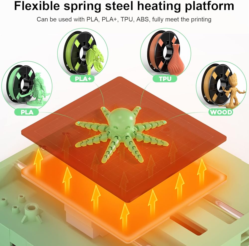 التسوية التلقائية ومنصة التسخين: تحتوي الطابعة ثلاثية الأبعاد الصغيرة على نظام تسوية تلقائي مدمج يلغي الحاجة إلى التعديلات اليدوية للطباعة الناجحة. تتميز بلوحة بناء فولاذية مرنة وقابلة للإزالة لتقليل مشكلات صفحة النموذج، وإزالة المطبوعات بسهولة، وسهولة تنظيف المنصة.