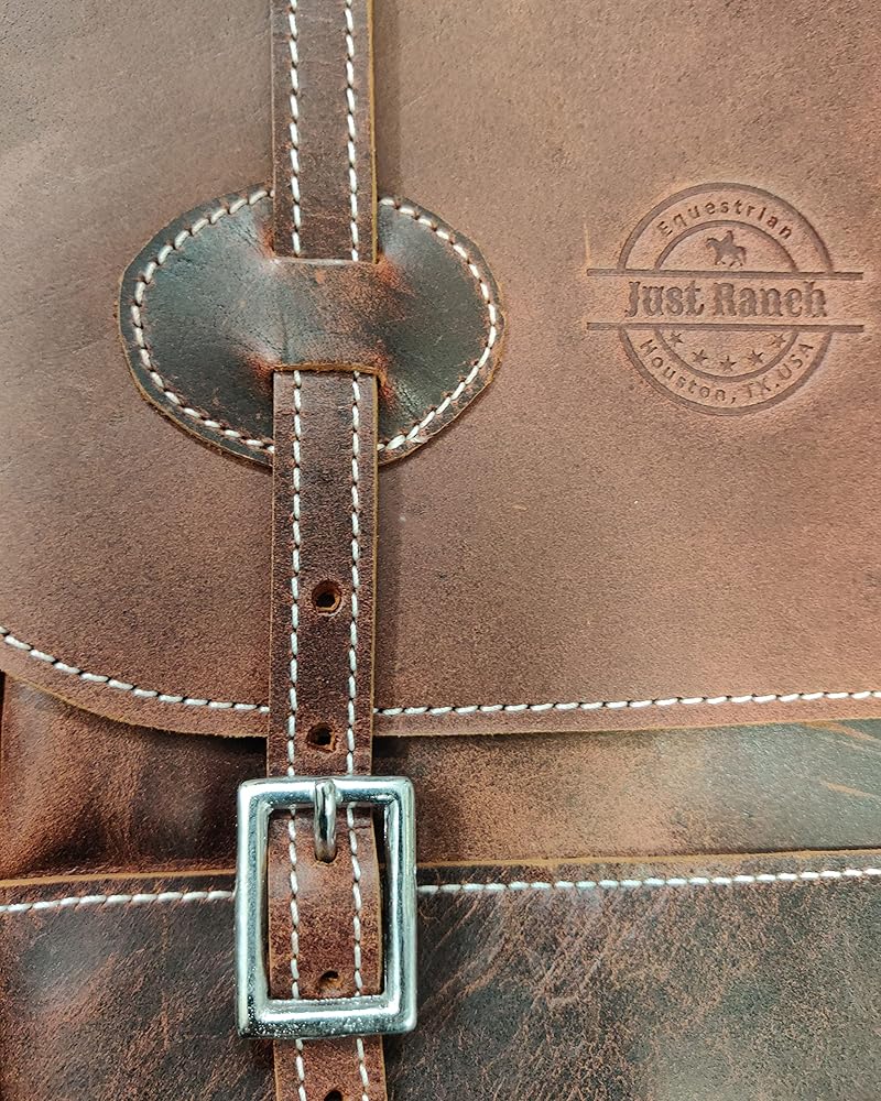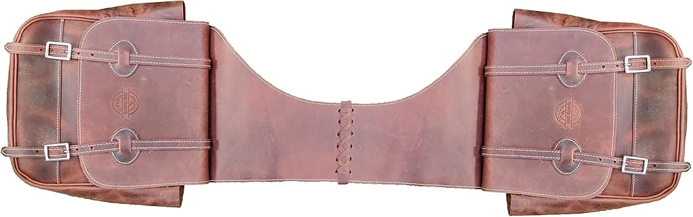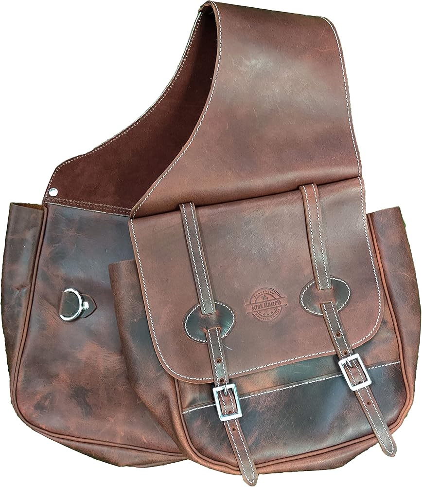 This Leather saddle bag will allow you to carry your belongings on the trail in style. Plenty of room for all your necessities. Perfect western saddle bag that is a must for trail riding or camping trips. Super nice and great quality This Saddle Bag is made of drum-dyed oiled leather stitched and riveted. Adjustable buckle closure easy opening and closing. Measurement- 10 x 10 with a 4 inch gusset. 20 inch apart. It features two beautiful nickel-coated buckle closures on each side for security.