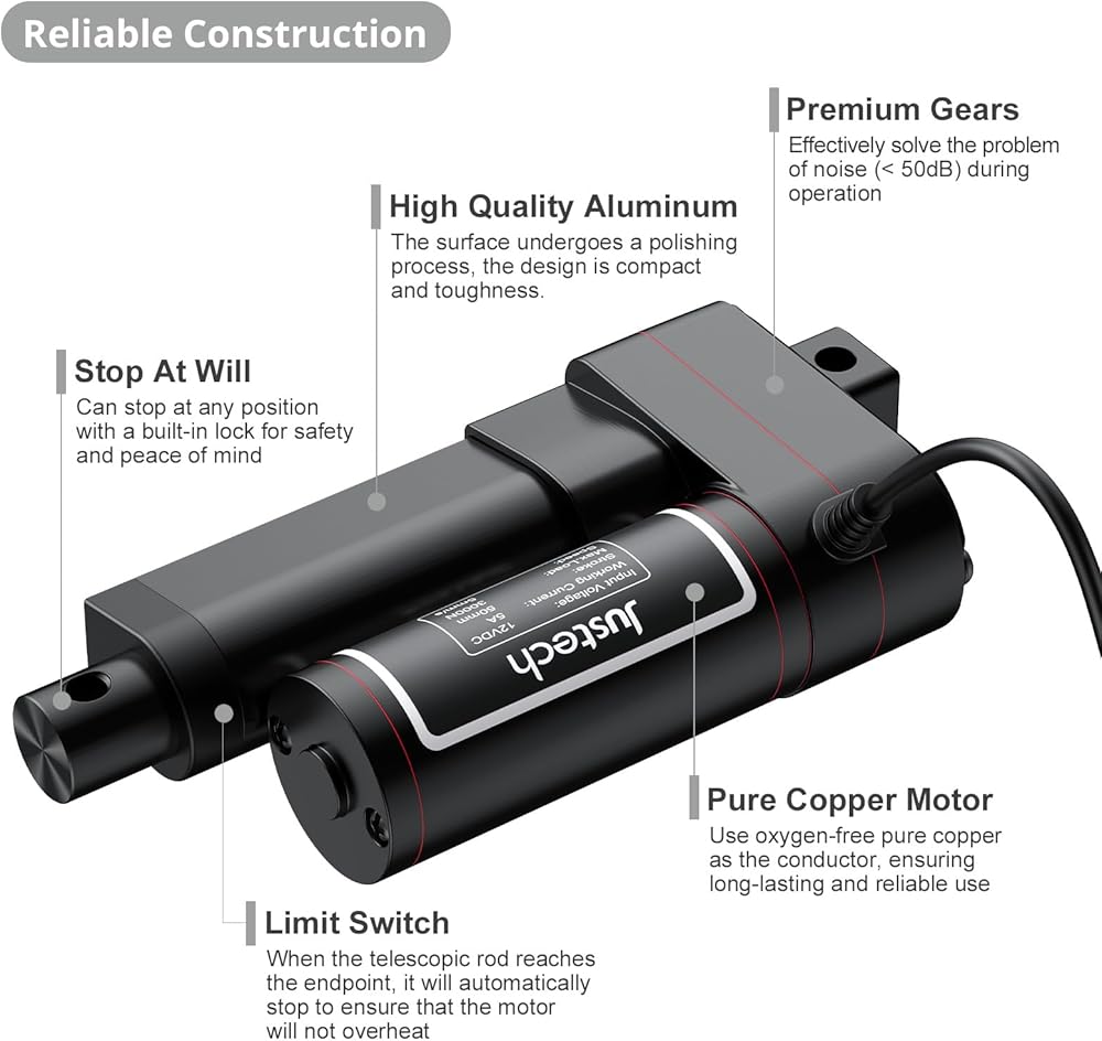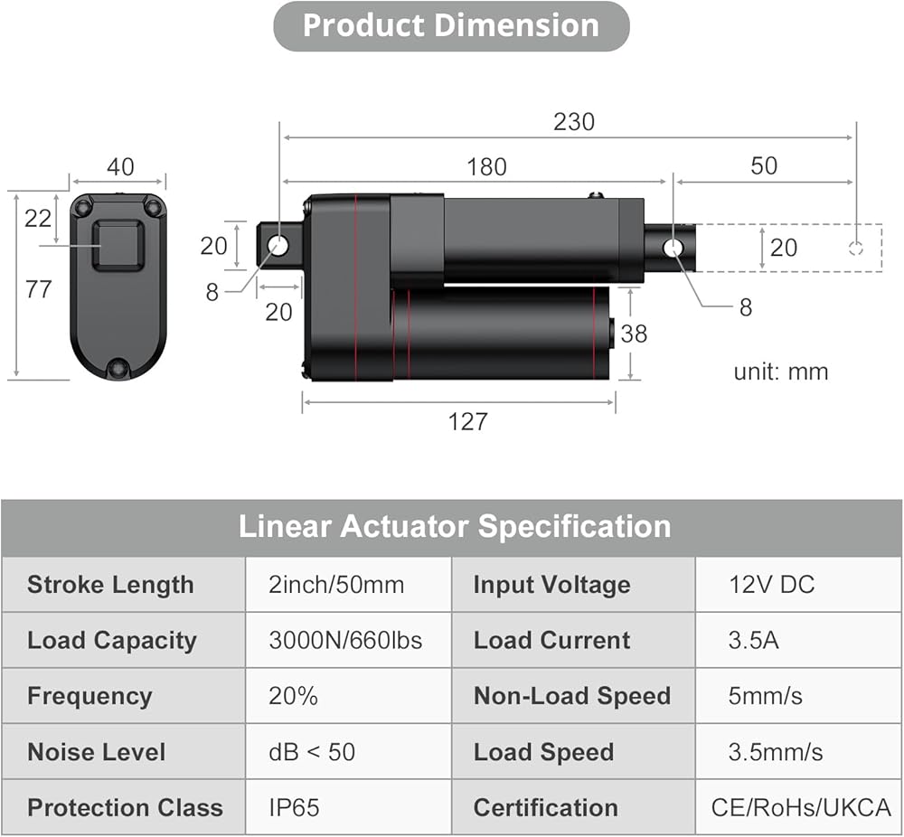 【محرك خطي عالي الجودة】طول الشوط 2 قدم (50 مم)، طول الانكماش 7 أقدام (180 مم)، طول التمديد 9 أقدام (230 مم)، جهد الإدخال 12 فولت تيار مستمر، بحد أقصى. الدفع 3000N/660LBS، تيار الحمل 3.5A، بدون تحميل 5 مم/ثانية، تحميل 3.5 مم/ثانية، يمكن استخدامه لتحريك الكائن في خط مستقيم، بحيث يتم دفعه وسحبه لأعلى ولأسفل.