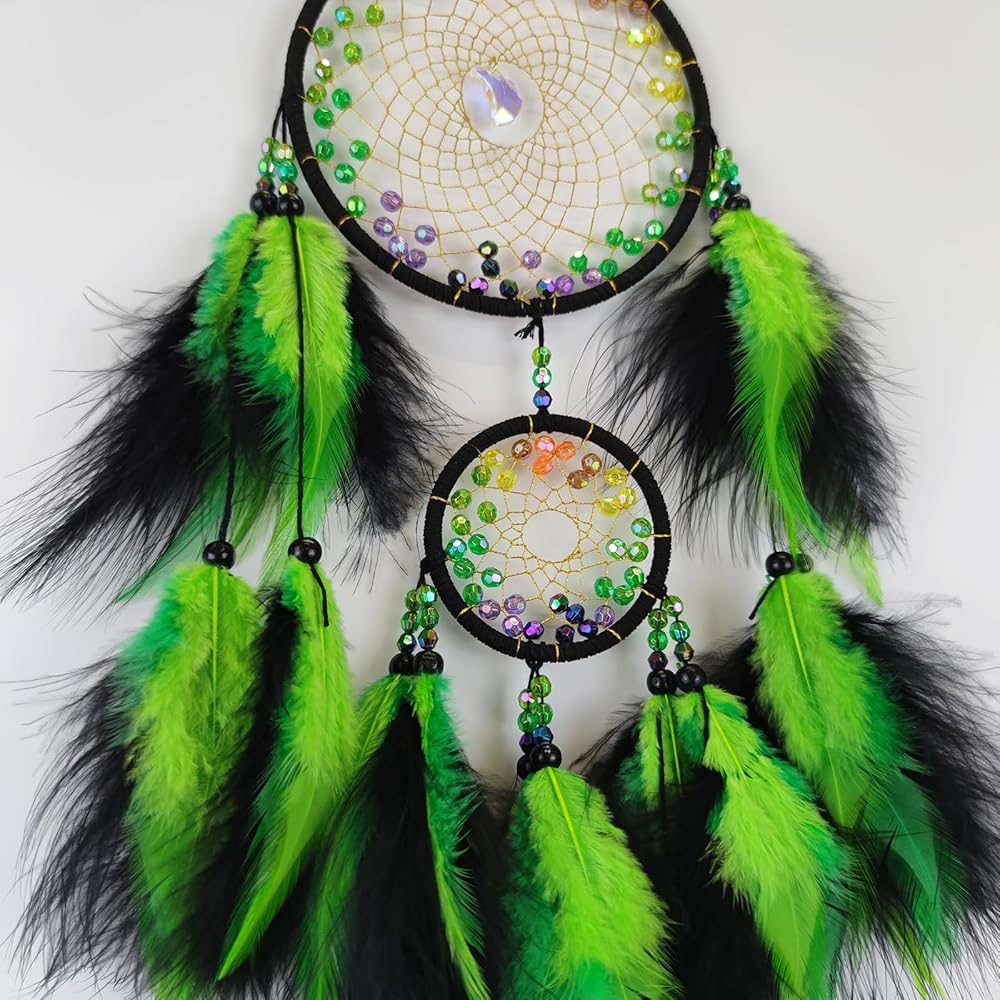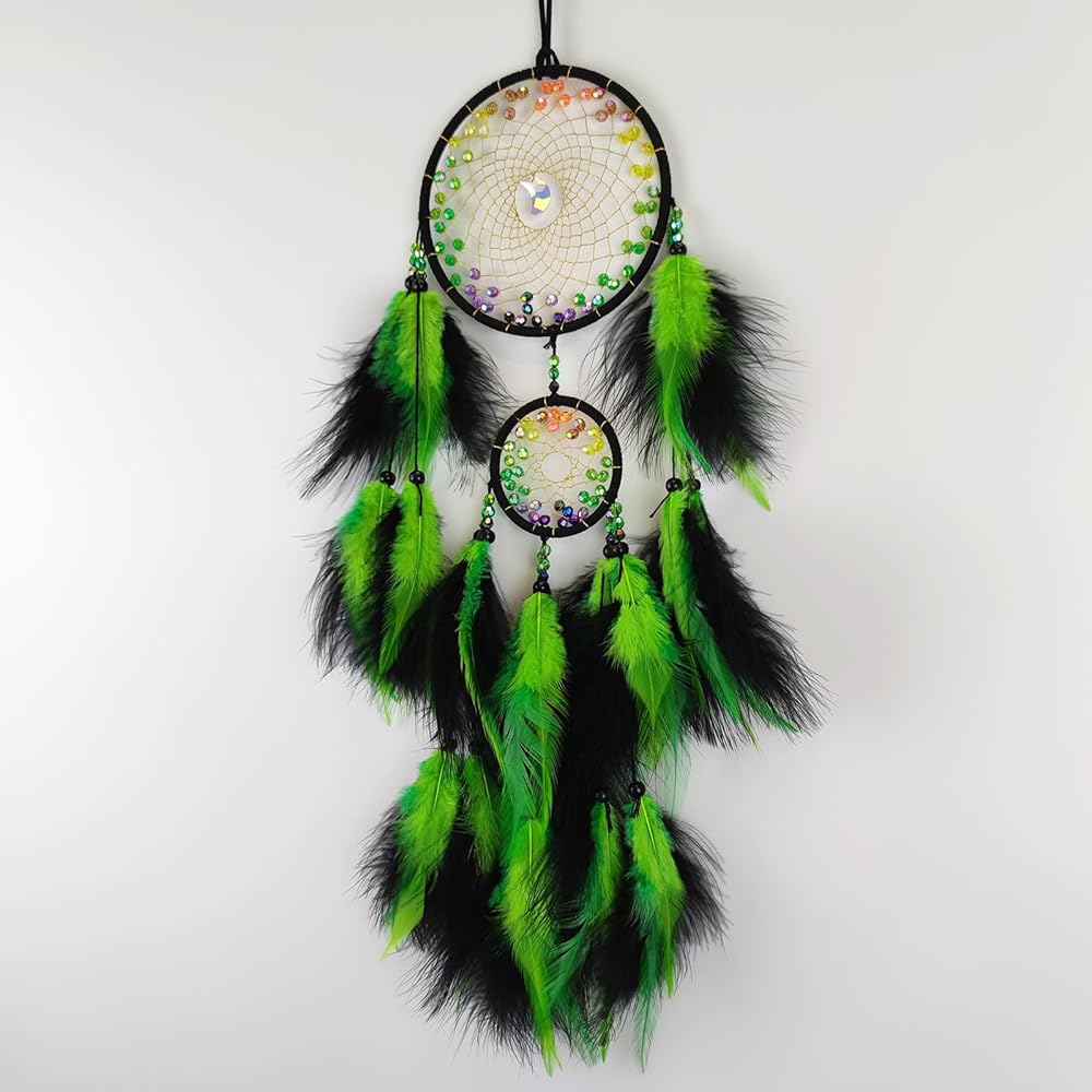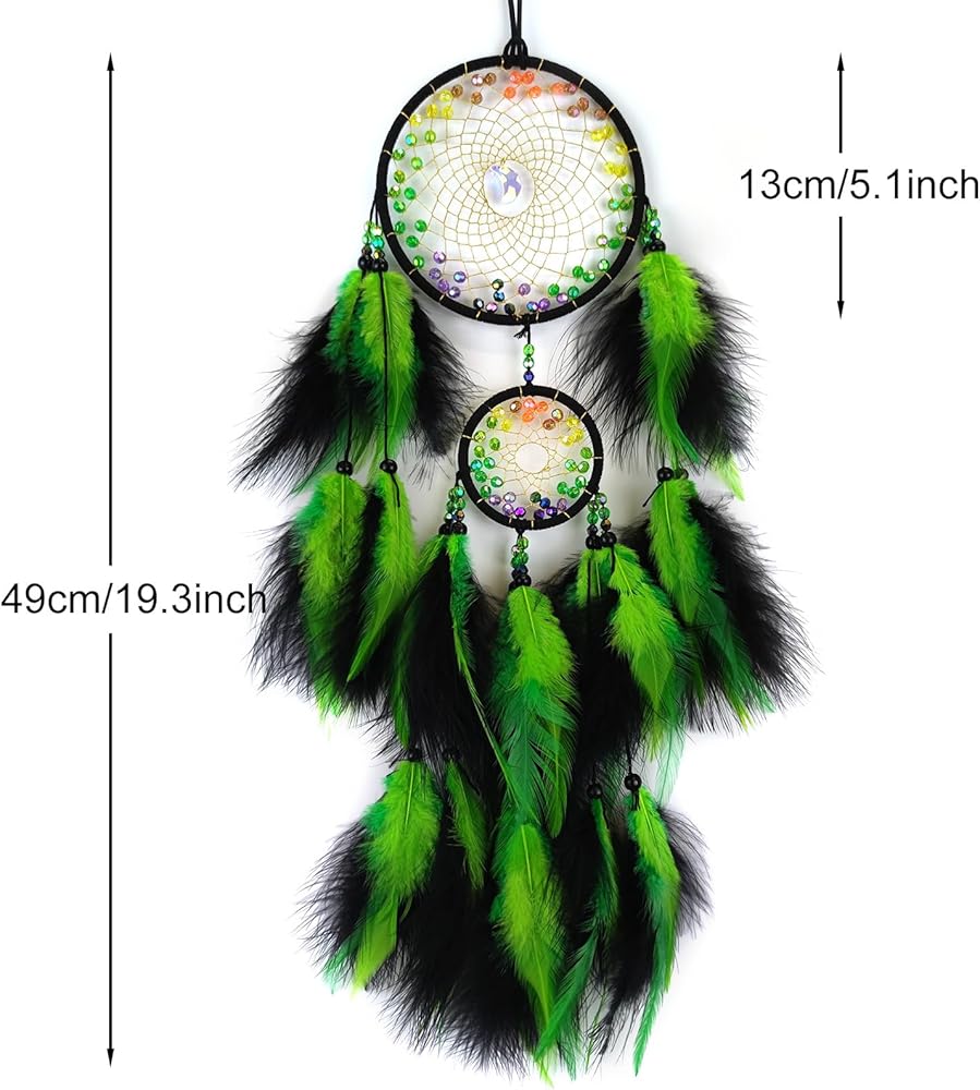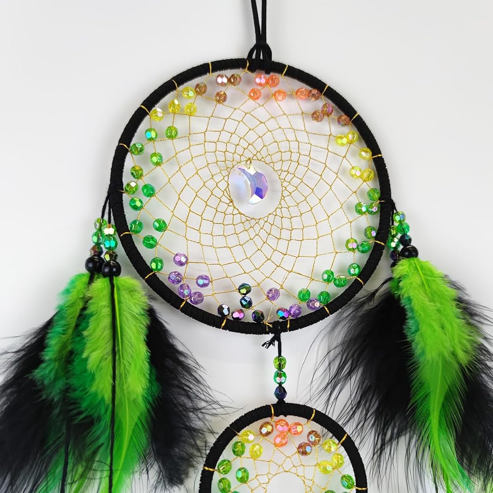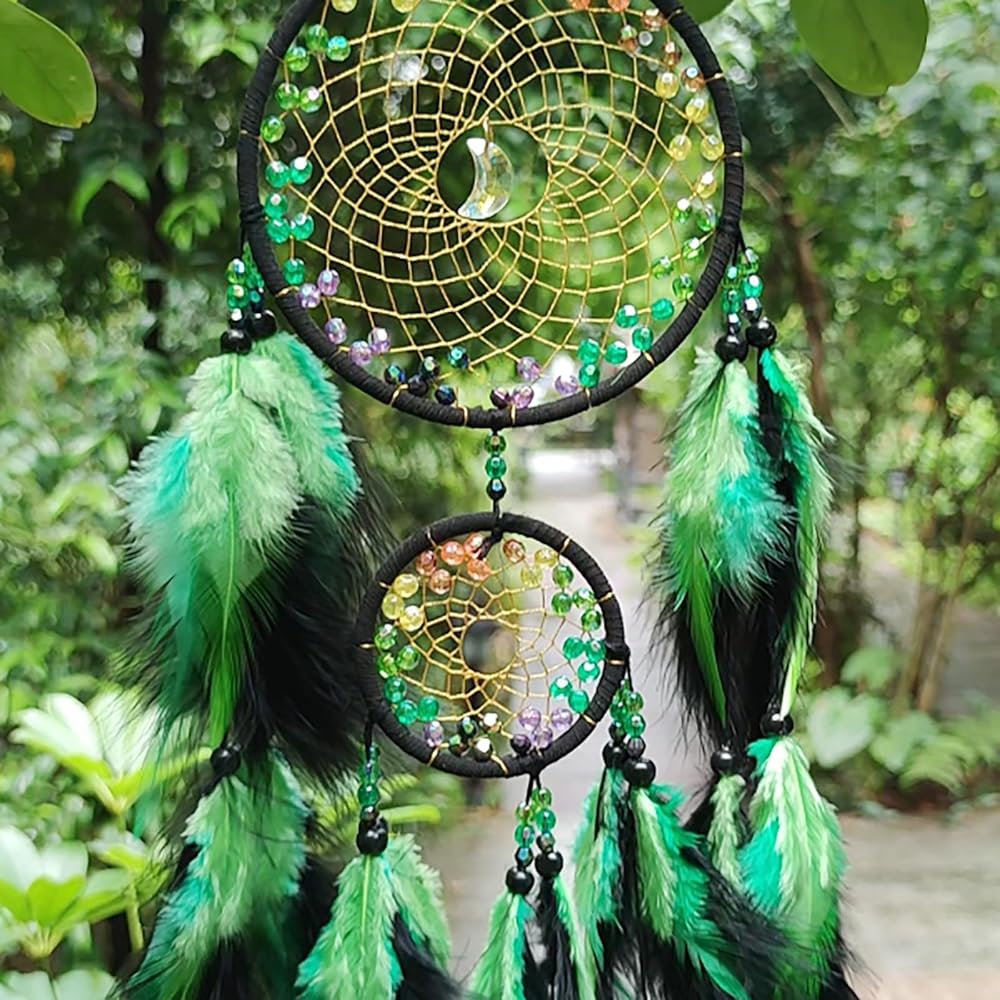 صائد أحلام الريش الأخضر والأسود مصنوع يدويًا صائد أحلام صغير مع قلادة على شكل قمر صائد الأحلام لغرفة النوم ريشة معلقة على الحائط