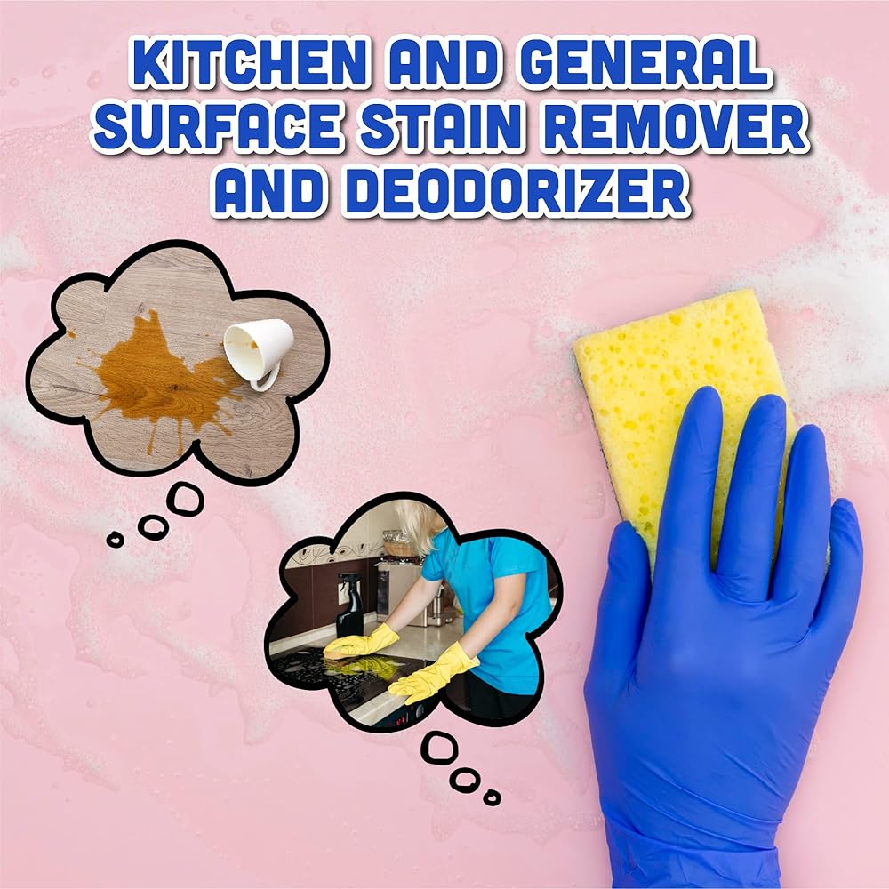 طبيعي بالكامل، منظف لجميع الأغراض. قم بتنظيف وإزالة البقع العنيدة وتغير الألوان على مجموعة متنوعة من الأسطح الناعمة والصلبة بما في ذلك أسطح العمل والسجاد والغسيل والمزيد!
