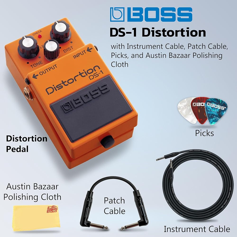 حزمة التشويه Boss DS-1 مع كابل الآلة، وكابل التصحيح، واللقطات، وقماش تلميع Austin Bazaar