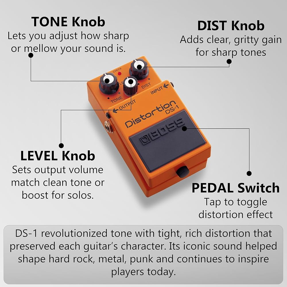 The DS-1 Distortion is a true icon in the world of guitar effects. Introduced in 1978, BOSS's first distortion pedal defined a bold new sound, delivering a hard-edged attack and smooth sustain that's been a staple of players for generations. The DS-1 is the top-selling BOSS compact pedal ever, and its original, unchanged design continues to inspire the creation of great music everywhere. The classic DS-1 tone is behind the signature sounds of numerous rock legends and is ready to fuel your signature sound today.