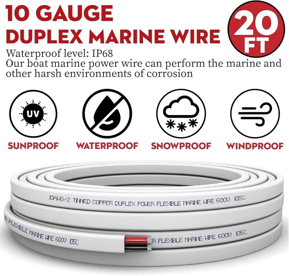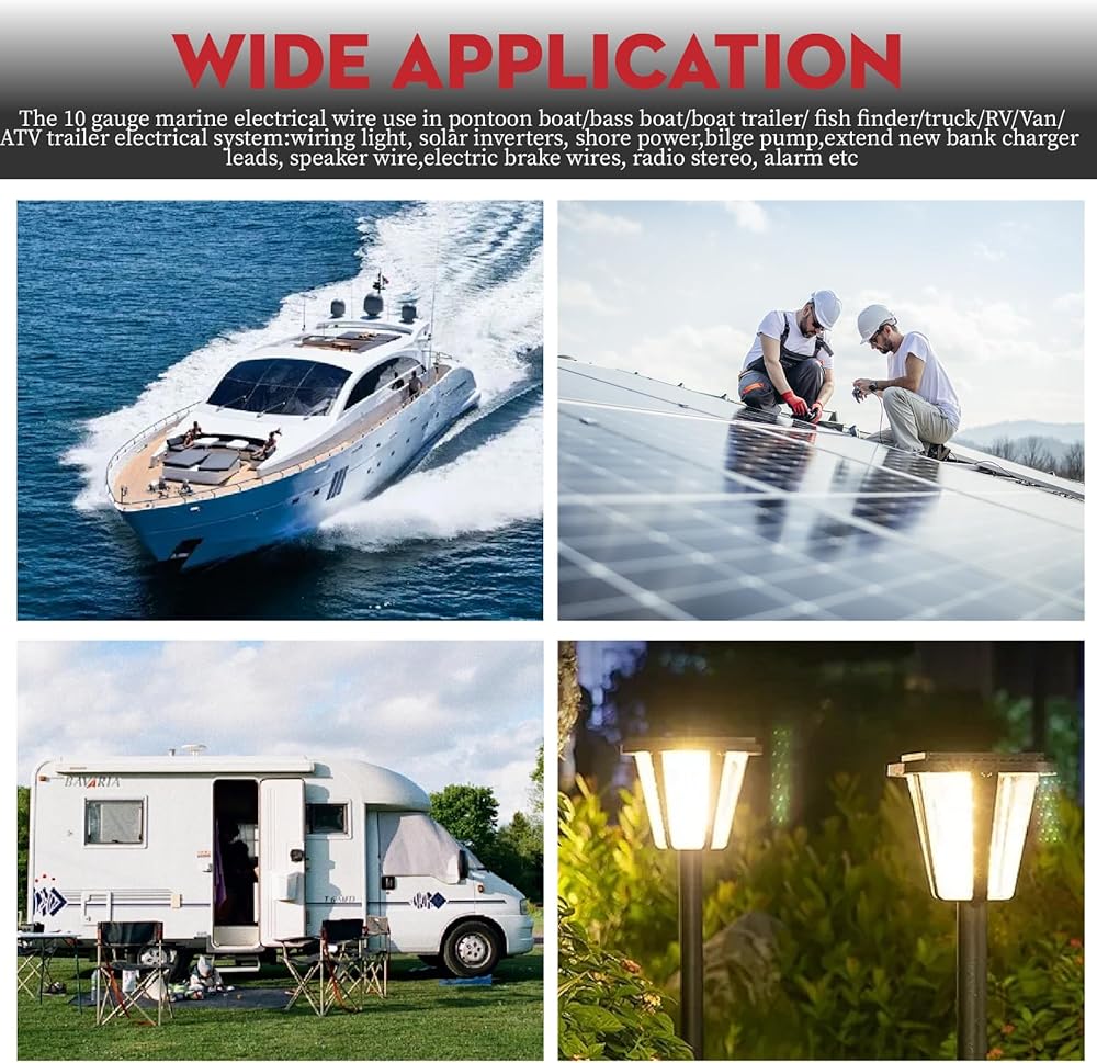 WIDELY USED: The 10 gauge marine electrical wire use in pontoon boat/bass boat/boat trailer/ fish finder/truck/RV/Van/ATV trailer electrical system:wiring light (spotlight,underwater light,flood light, navigation lights,headlight), solar inverters, shore power,bilge pump,extend new bank charger leads, speaker wire,electric brake wires, radio stereo, alarm etc