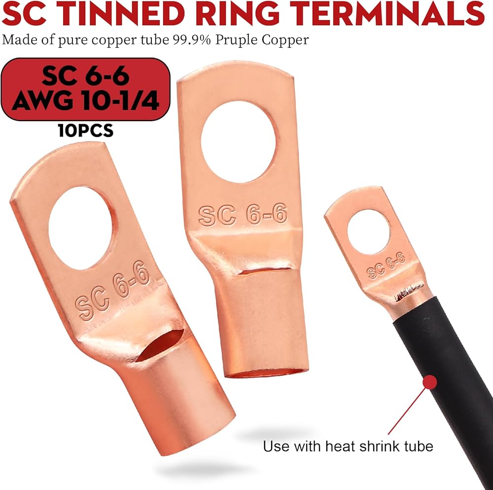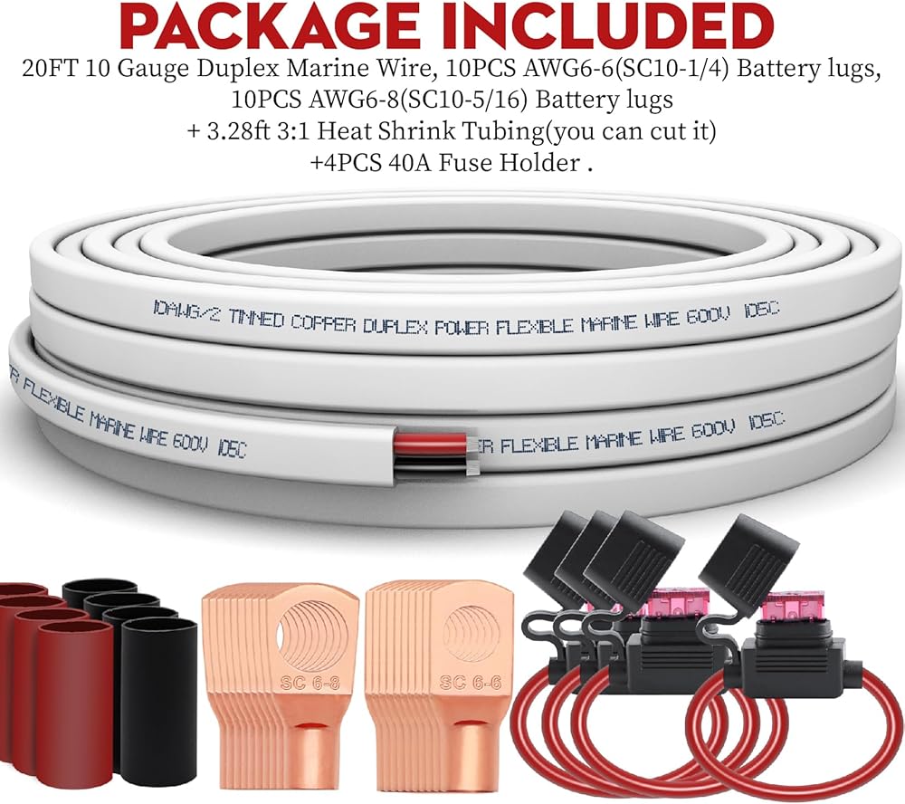 PACKAGE INCLUDED:20FT 10 Gauge Duplex Marine Wire, 10PCS AWG6-6(SC10-1/4) Battery lugs,10PCS AWG6-8(SC10-5/16) Battery lugs + 3.28ft 3:1 Heat Shrink Tubing and 4PCS 40A Fuse Holder .