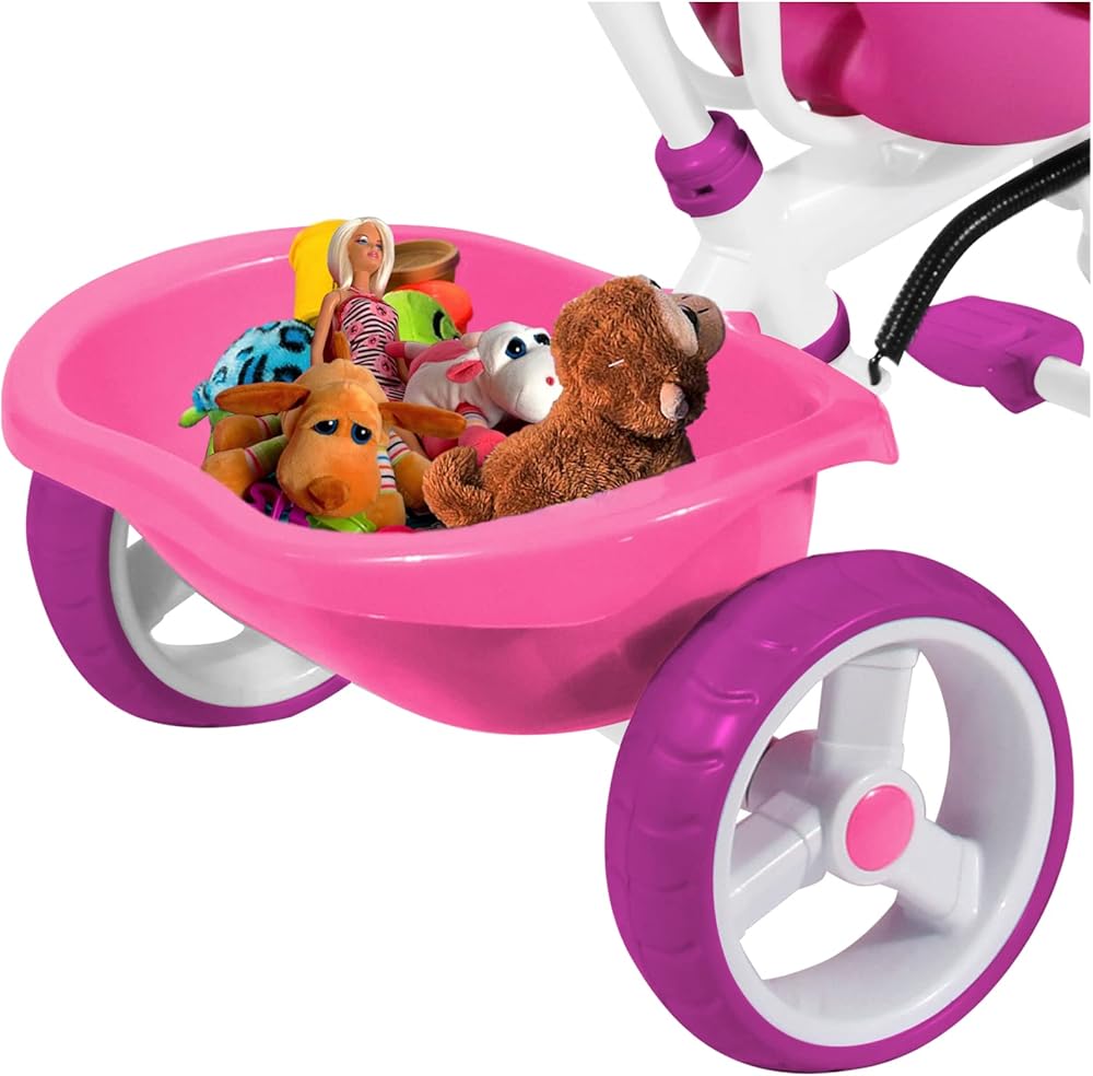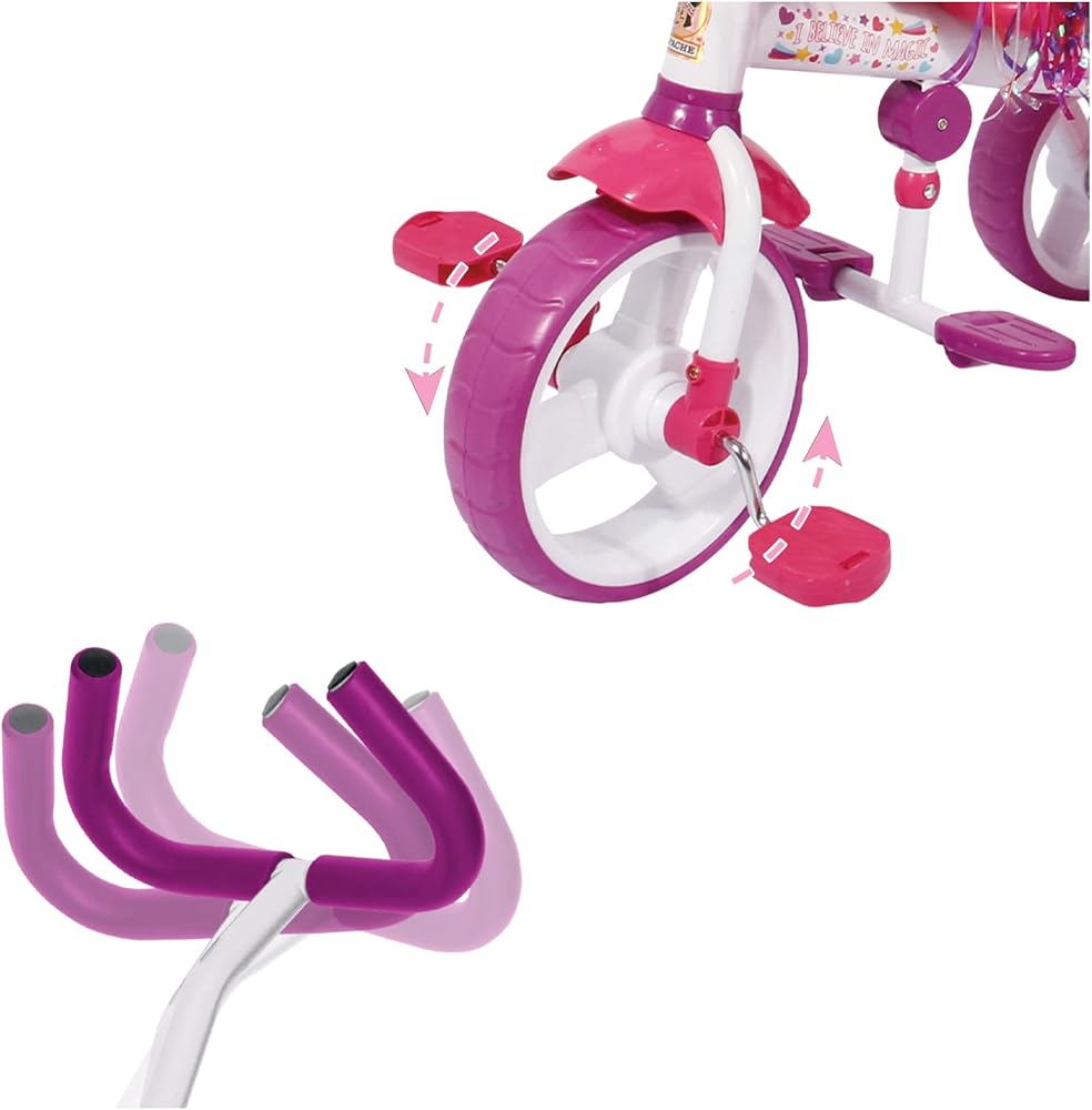 • Your little one will adore the charming design of our 3-in-1 tricycle. With its bright colors, and playful design it is sure to turn heads wherever you go. This model comes with an adorable front pocket featuring a plush unicorn.